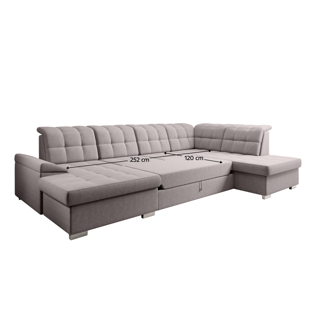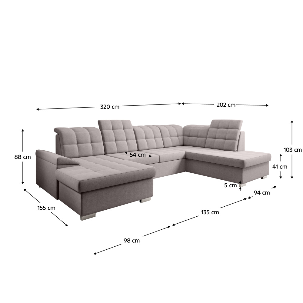 Materiál čalounění: látka Soro 23 Oděruodolnost látky podle testu Martindale: 90 000 Barva čalounění: šedobéžová Taupe Rozměry (ŠxHxV): 320x202/155x88/103 cm Plocha na spaní (ŠxD): 120x252 cm Výška sedu: 41 cm Hloubka sedu: 54 cm Šířka otomanu: 98 cm Šířka sedáku: 135 cm Na nožičkách Materiál nožiček: plast Barva nožiček: stříbrná Výška spodního prostoru od podlahy: 5 cm Nosnost na osobu: 90 kg Výplň: pružina falista + Pur pěna Rozkládací Rohová Celočalouněná Tvar U Se dvěma úložnými prostory Polohovací opěrky hlavy Pravé provedení Dodáváno v demontu Možnost objednání v 7 barevných odstínech látky Soro v ceně 44.190 Kč s dodací lhůtou 6-8 týdnů. Při individuální objednávce je třeba zaplatit 20% zálohu z dané částky. Po uhrazení zálohy bude Váš požadavek zadán do výroby.