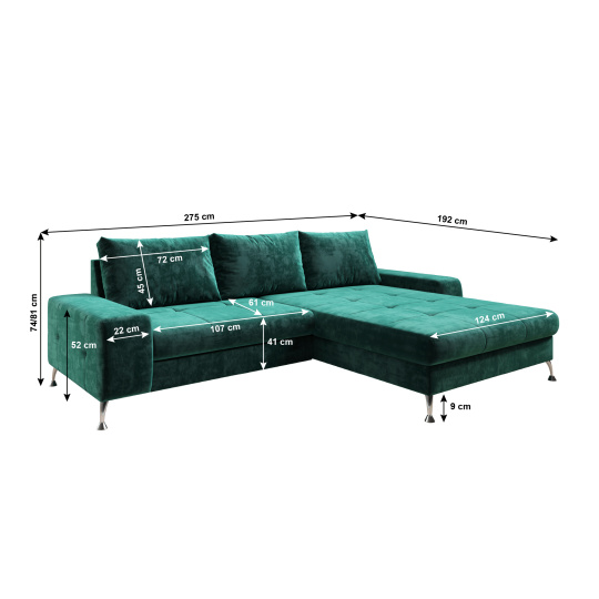 Materiál: látka Monolith 37 Oděruodolnost textilie podle testu Martindale: 100 000 oděrů Barva: smaragdová Rozměry (ŠxHxV): 275x192x74/81 cm Výška sedu: 41 cm Hloubka sedu: 61 cm Výška spodního prostoru od podlahy: 9 cm Rozměr opěrky na ruku (ŠxH): 22x52 cm Šířka otomanu: 124 cm Rozkládací Plocha na spaní (ŠxD): 145x220 cm Nosnost na osobu: 90 kg Rohová S úložným prostorem Dekorativní prošití Výplň: pružina falista/pur pěna Na kovových nožičkách Barva nožiček: chrom Celočalouněná Pravé provedení Dodávána s polštáři Rozměr polštářů (ŠxH): 72x45 cm Dodáváno v demontu Nabízíme vám možnost objednat si sedačku v 7 barevných provedeních látky Monolith v ceně: 24.050 Kč. Při individuální objednávce je třeba zaplatit 20% zálohu z dané částky. Po uhrazení zálohy bude Váš požadavek zadán do výroby. Doba dodání 6-8 týdnů.