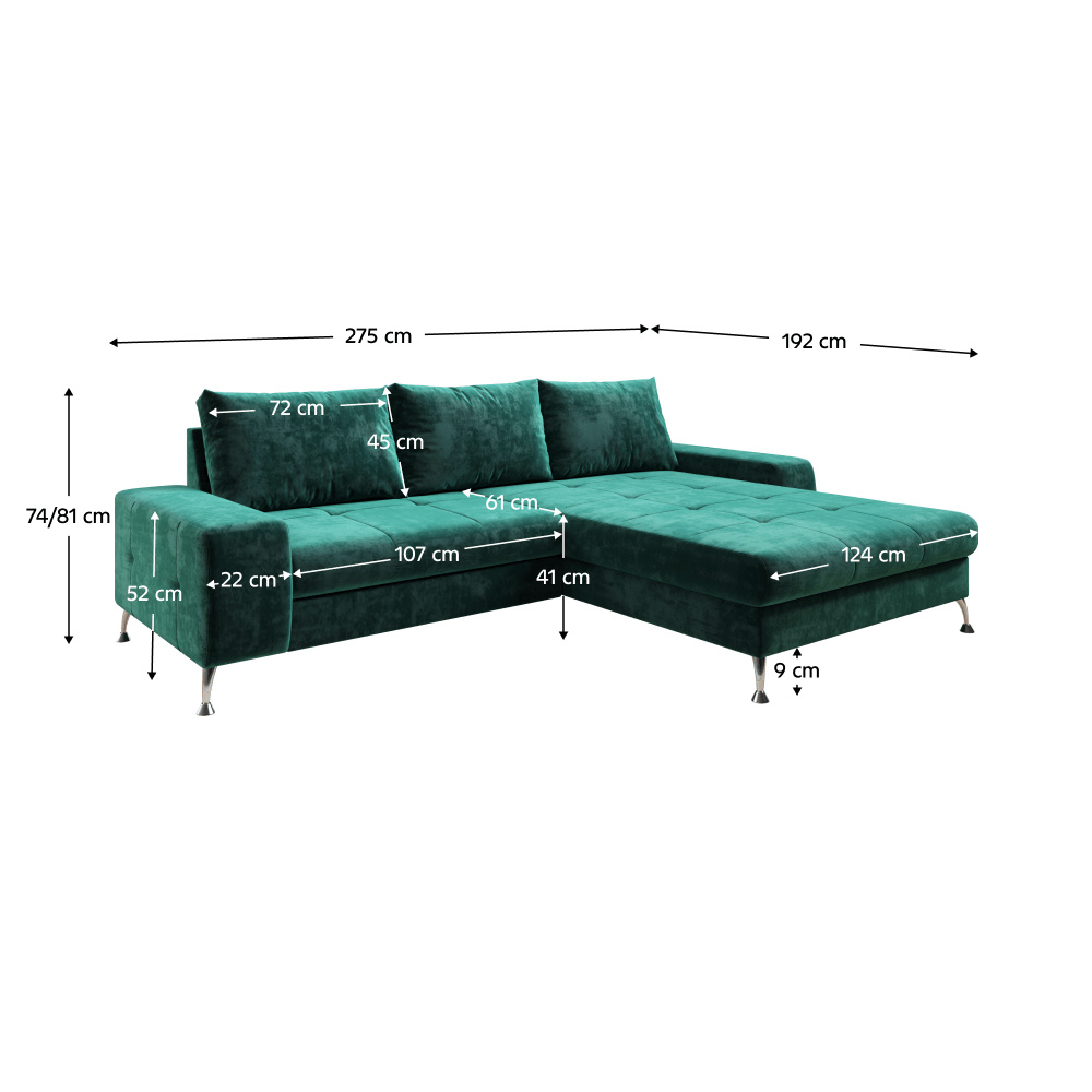 Materiál: látka Monolith 37 Oděruodolnost textilie podle testu Martindale: 100 000 oděrů Barva: smaragdová Rozměry (ŠxHxV): 275x192x74/81 cm Výška sedu: 41 cm Hloubka sedu: 61 cm Výška spodního prostoru od podlahy: 9 cm Rozměr opěrky na ruku (ŠxH): 22x52 cm Šířka otomanu: 124 cm Rozkládací Plocha na spaní (ŠxD): 145x220 cm Nosnost na osobu: 90 kg Rohová S úložným prostorem Dekorativní prošití Výplň: pružina falista/pur pěna Na kovových nožičkách Barva nožiček: chrom Celočalouněná Pravé provedení Dodávána s polštáři Rozměr polštářů (ŠxH): 72x45 cm Dodáváno v demontu Nabízíme vám možnost objednat si sedačku v 7 barevných provedeních látky Monolith v ceně: 24.050 Kč. Při individuální objednávce je třeba zaplatit 20% zálohu z dané částky. Po uhrazení zálohy bude Váš požadavek zadán do výroby. Doba dodání 6-8 týdnů.