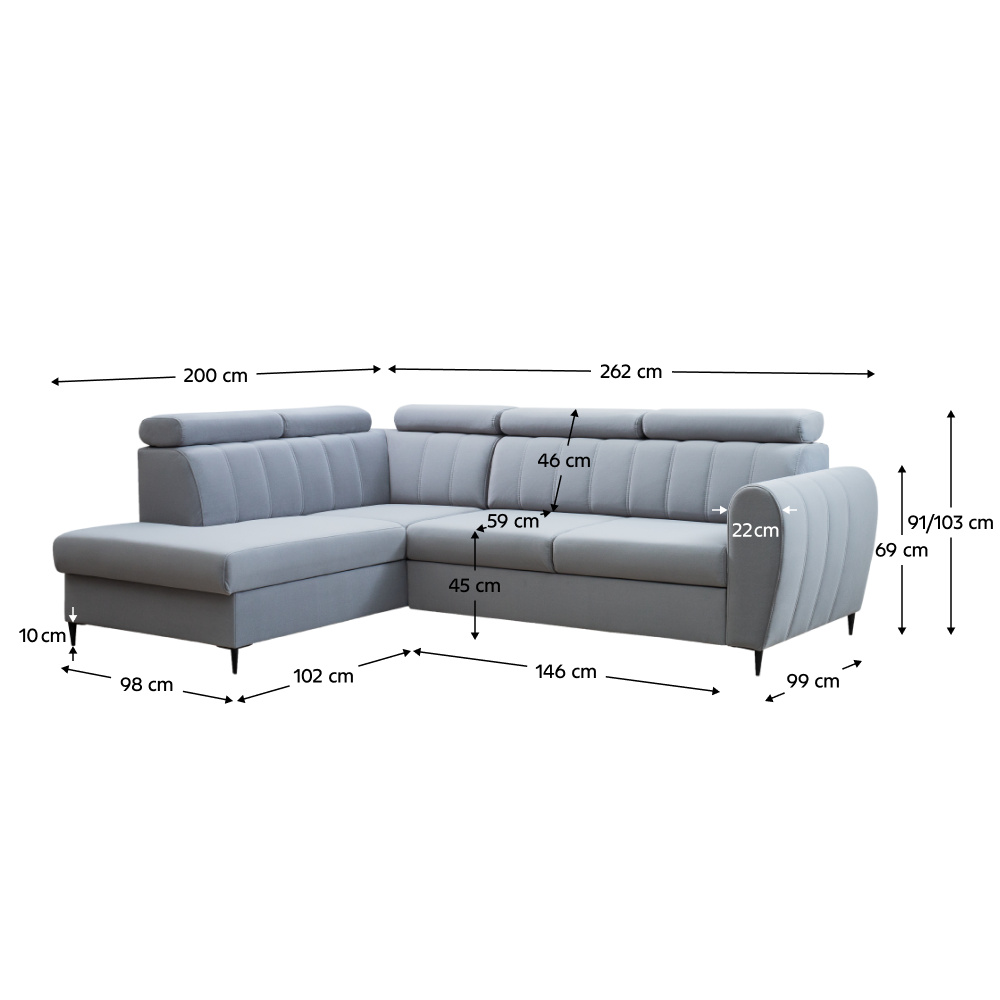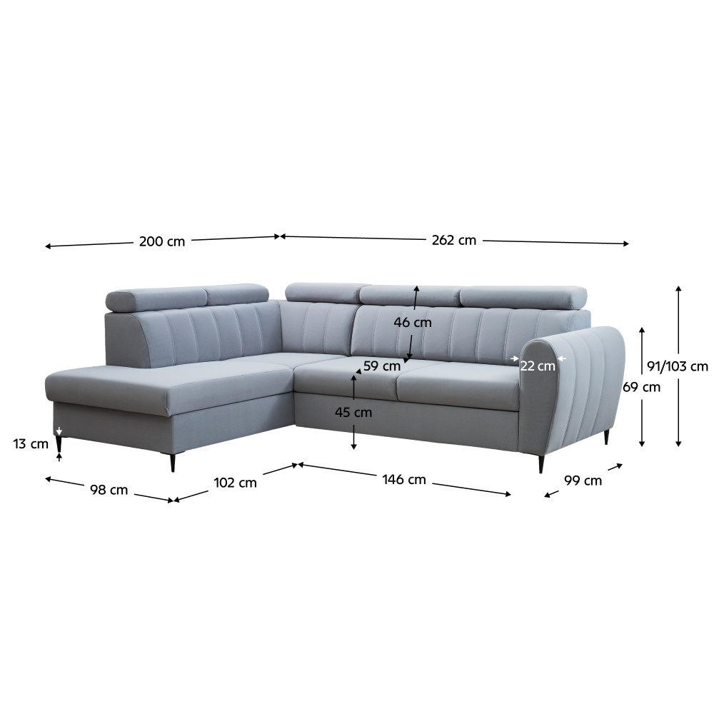 Materiál čalounění: látka Paros 05 Oděruodolnost látky podle testu Martindale: 50 000 Barva čalounění: světle šedá Rozměry (ŠxHxV): 262x200x91/103 cm Plocha na spaní (ŠxD): 128x210 cm Výška sedu: 45 cm Hloubka sedu: 46/59 cm Šířka otomanu: 98 cm Šířka sedáku: 146 cm Rozměry opěrky na ruce (ŠxHxV): 22x99x69 cm Výška spodního prostoru od podlahy: 10 cm Na nožičkách Materiál nožiček: kov Barva nožiček: černá Nosnost na osobu: 90 kg Výplň: pružina falista + Pur pěna Rozkládací Rohová Celočalouněná Levé provedení S úložným prostorem Polohovací opěrky hlavy Dodáváno v demontu Možnost objednání ve 4 barevných odstínech látky Paros a ve 4 barevných odstínech látky Kronos s dodací lhůtou 6-8 týdnů. Při individuální objednávce je třeba zaplatit 20% zálohu z dané částky. Po uhrazení zálohy bude Váš požadavek zadán do výroby.