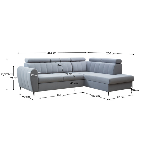 Materiál čalounění: látka Paros 05 Oděruodolnost látky podle testu Martindale: 50 000 Barva čalounění: světle šedá Rozměry (ŠxHxV): 262x200x76/91 cm Plocha na spaní (ŠxD): 128x210 cm Výška sedu: 45 cm Hloubka sedu: 46/59 cm Šířka otomanu: 98 cm Šířka sedáku: 146 cm Rozměry opěrky na ruce (ŠxHxV): 22x99x69 cm Výška spodního prostoru od podlahy: 10 cm Na nožičkách Materiál nožiček: kov Barva nožiček: černá Nosnost na osobu: 90 kg Výplň: pružina falista + Pur pěna Rozkládací Rohová Celočalouněná Pravé provedení S úložným prostorem Polohovací opěrky hlavy Dodáváno v demontu Možnost objednání ve 4 barevných odstínech látky Paros a ve 4 barevných odstínech látky Kronos s dodací lhůtou 6-8 týdnů. Při individuální objednávce je třeba zaplatit 20% zálohu z dané částky. Po uhrazení zálohy bude Váš požadavek zadán do výroby.