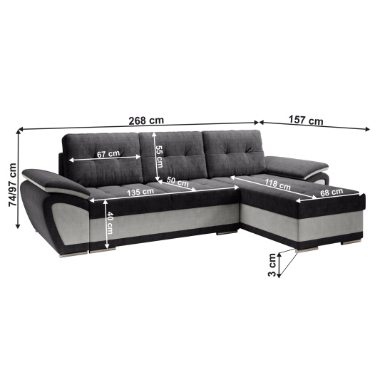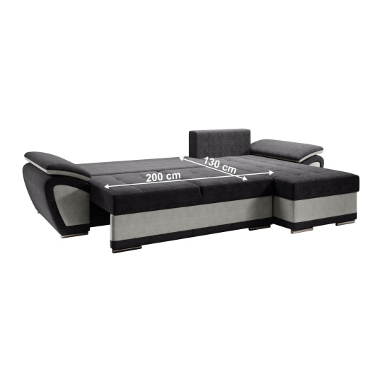 Materiál: látka Orinoco 90/96 Oděruodolnost textilie podle testu Martindale: 72 000 oděrů Barva: světle šedá/tmavě šedá Rozměry (ŠxHxV): 268x157x97 cm Výška sedu: 40 cm Hloubka sedu: 50 cm Výška spodního prostoru od podlahy: 3 cm Rozkládací Plocha na spaní (ŠxD): 130x200 cm Výška opěrky na záda: 50 cm Rozměry otomanu (ŠxH): 68x118 cm Opěrka na ruku (ŠxH): 31x90 cm Nosnost na osobu: 90 kg Rohová S úložným prostorem Dekorativní prošití Výplň: pružina falista/pur pěna Na plastových nožičkách Barva nožiček: stříbrná Celočalouněná Pravé provedení Dodáváno se třemi polštáři Rozměry polštářů (ŠxH): 67x55 cm Dodáváno v demontu