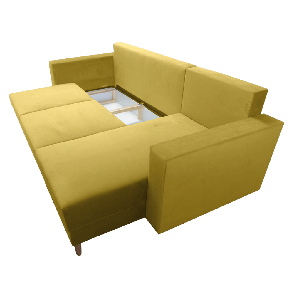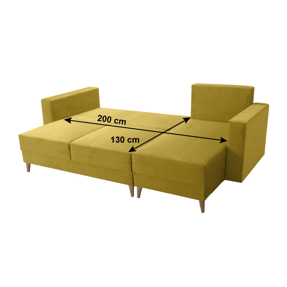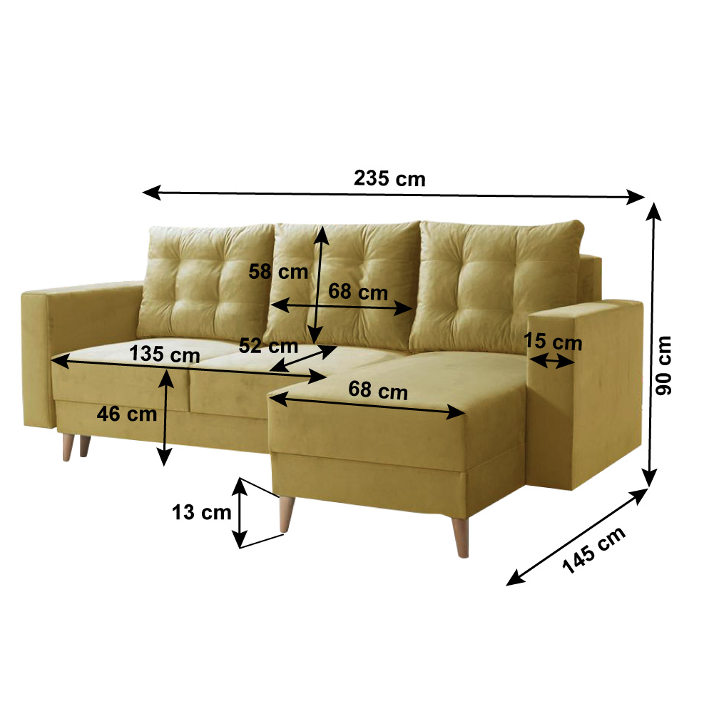 Materiál čalounění: látka Kronos 11 Oděruodolnost látky podle testu Martindale: 50 000 Barva čalounění: žlutá Rozměry (ŠxHxV): 235x145x90 cm Plocha na spaní (ŠxD): 130x200 cm Výška sedu: 46 cm Hloubka sedu: 52 cm Šířka otomanu: 68 cm Šířka sedáku: 135 cm Šířka opěrky na ruku: 15 cm Výška spodního prostoru od podlahy: 13 cm Na dřevěných nožičkách Barva nožiček: buk Nosnost na osobu: 90 kg Výplň: pružina falista + Pur pěna Dodávána se třemi polštáři Rozměry polštářů (ŠxV): 68x58 cm Rozkládací Rohová Celočalouněná S úložným prostorem Pravé provedení Dodáváno v demontu