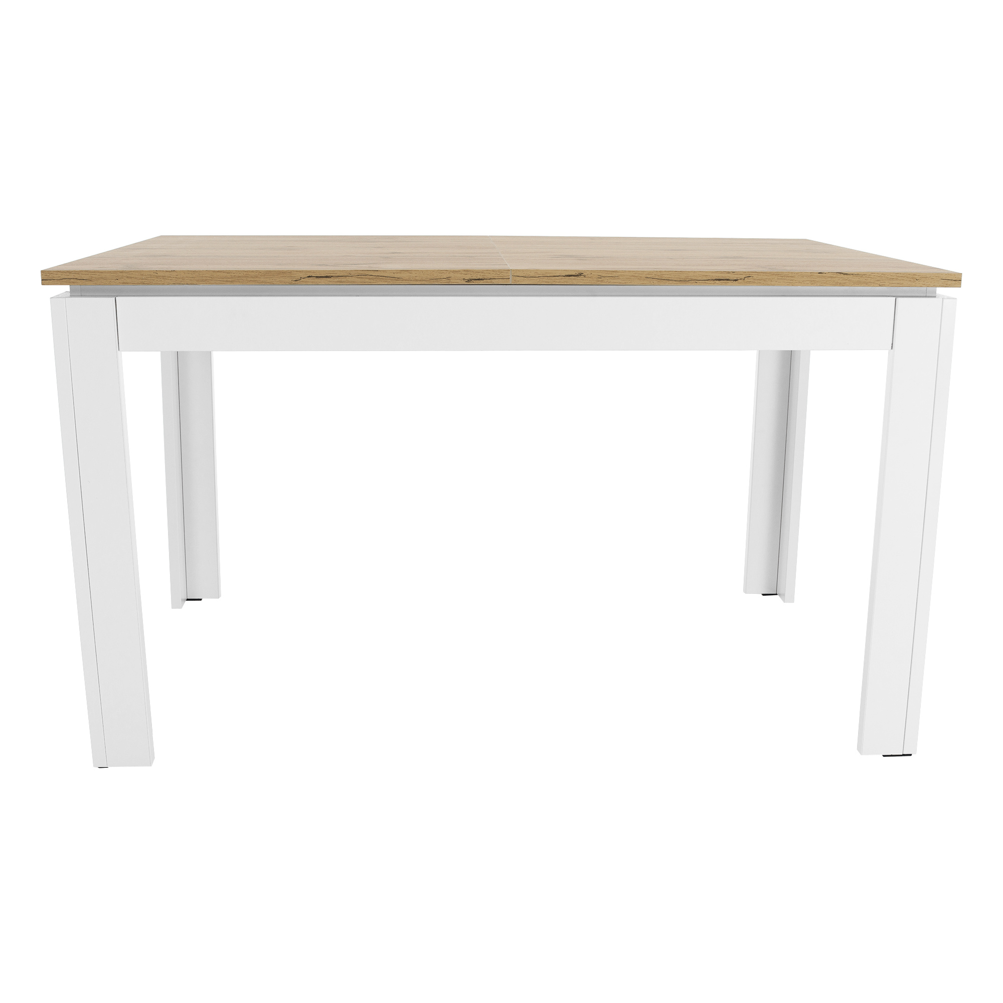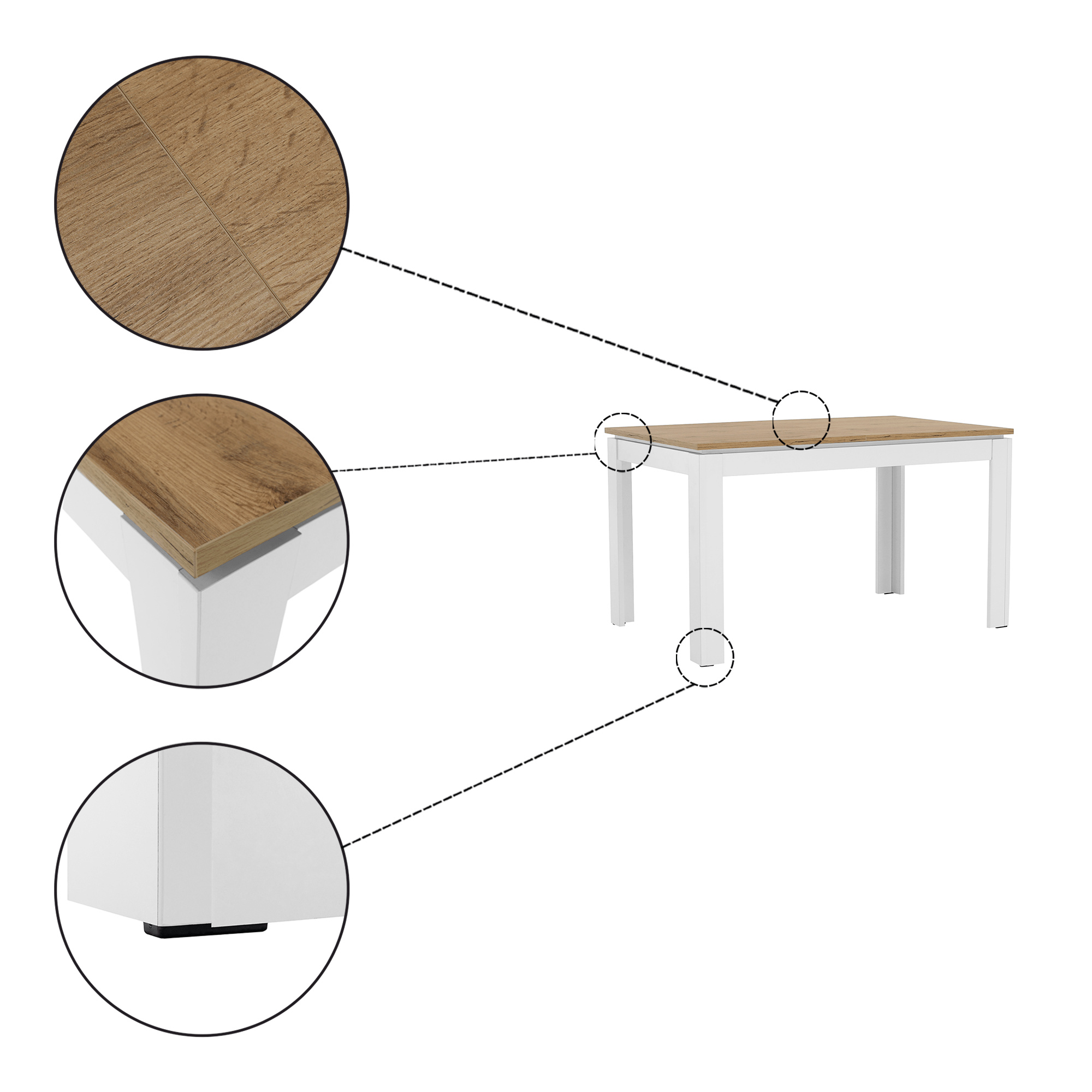 Materiál: DTD laminovaná/ABS hrany Barva: bílá/dub wotan Rozměry (ŠxHxV): 135-184x86x77,8 cm Tloušťka materiálu: 1,6 - 2,2 cm Nosnost: 80 kg Rozkládací Pro 6-8 osob ABS hrany Barevné spoje na stole se nemusí shodovat Dodáván v demontu