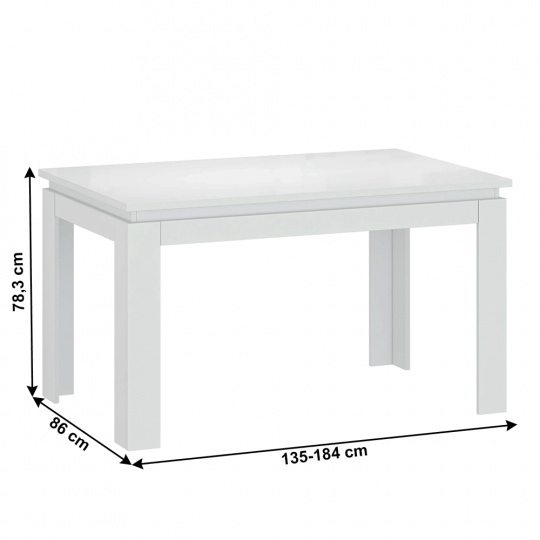 Materiál: laminovaná DTD Barva: bílá Rozměry (ŠxHxV): 135-184x86x78,3 cm Tloušťka materiálu: 1,6 cm ABS hrany rozkládací Rozklad do šířky 184 cm Moderní design a elegantní vzhled Dodávané v demontu