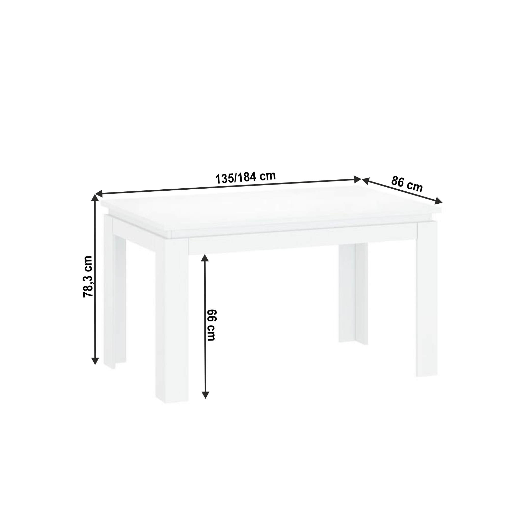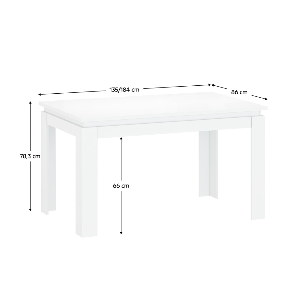 Materiál: laminovaná DTD Barva: bílá Rozměry (ŠxHxV): 135-184x86x78,3 cm Tloušťka materiálu: 1,6 cm ABS hrany rozkládací Rozklad do šířky 184 cm Moderní design a elegantní vzhled Dodávané v demontu
