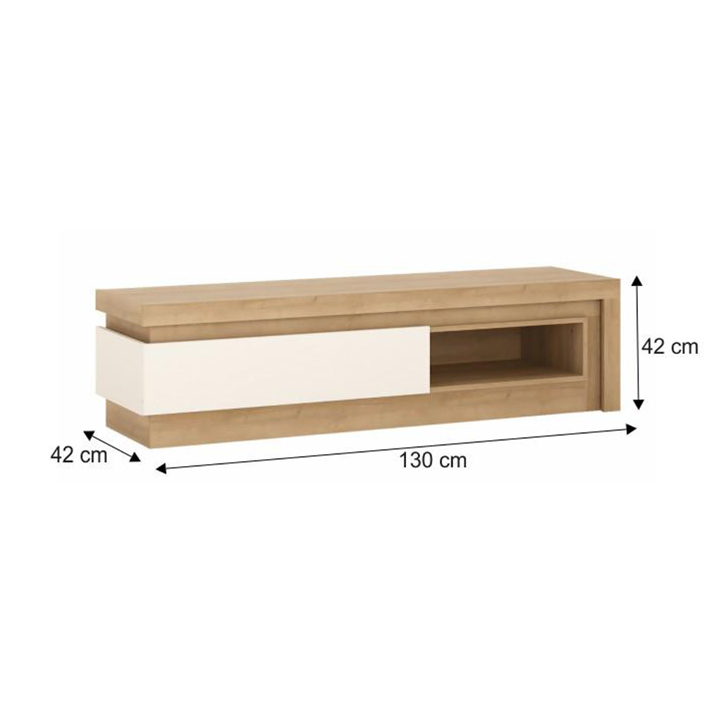 RTV stolek ze sektorové sestavy LEONARDO v provedení dub riviera / bílá s vysokým leskem. Rozměry (ŠxHxV): 130x42x42 cm Tloušťka materálu: 16 mm Systém tichého dorazu šuplíků LED osvětlení po obvodu je v ceně Dodávané v demontu