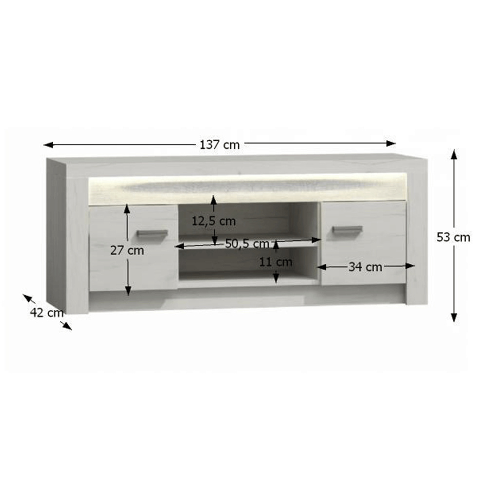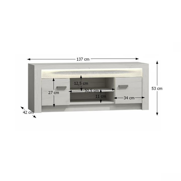 RTV stolek 09 z luxusního sektorového nábytku. Korpus hrubý až 48 mm, tloušťka materiálu zbývající části: 16 mm, úchytky kovové Materiál DTD laminovaná, ABS hrany, barevné provedení: jasan bílý Rozměry ŠxHxV: 137x42x53 cm. Možnost dokoupení LED osvětlení v ceně 1.090 Kč. Dodávané v demontu.