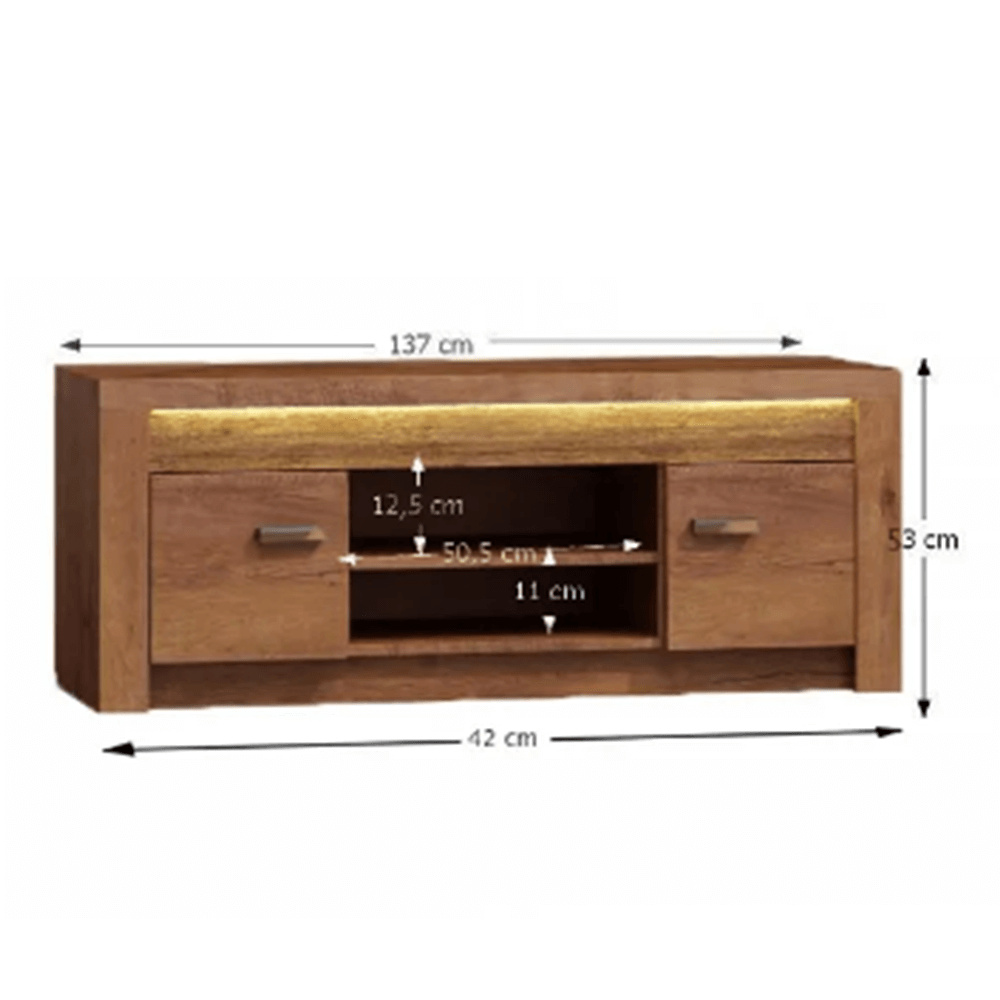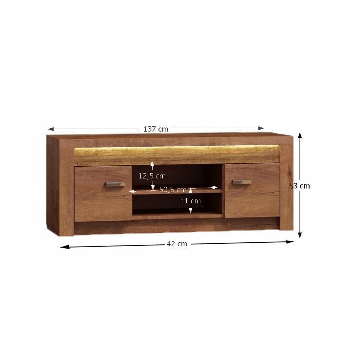 RTV stolek 09 z luxusního sektorového nábytku. Korpus hrubý až 48 mm, Tloušťka materiálu zbývající části: 16 mm, úchytky kovové Materiál DTD laminovaná, ABS hrany, barevné provedení: jasan světlý, Rozměry ŠxHxV: 137x42x53 cm. Možnost dokoupení LED osvětlení v ceně 1090 Kč. Dodávané v demontu.