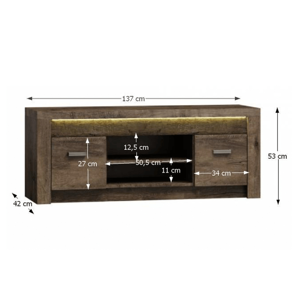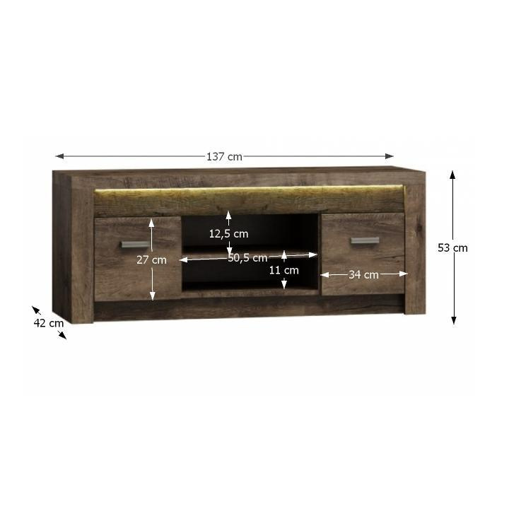 RTV stolek 09 z luxusního sektorového nábytku. Korpus hrubý až 48 mm, Tloušťka materiálu zbývající části: 16 mm, úchytky kovové Materiál DTD laminovaná, ABS hrany, barevné provedení: jasan tmavý, Rozměry ŠxHxV: 137x42x53 cm. Možnost dokoupení LED osvětlení v ceně 1090 Kč. Dodávané v demontu.