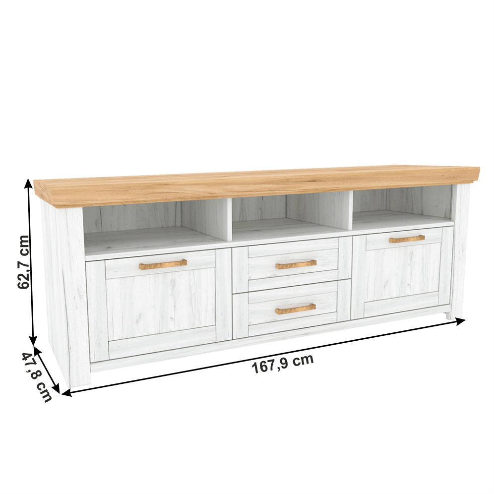 Materiál: DTD laminovaná / MDF laminovaná Barva: dub craft zlatý / dub craft bílý Rozměry (ŠxHxV): 167,9x47,8x62,7 cm Tloušťka materiálu korpus: 16 mm Tloušťka materiálu vrchní deska: 22 mm Tloušťka materiálu dvířka: 19 mm Výška spodního prostoru od podlahy je 4,2 cm dvou šuplíků dvou skříněk otevřený prostor Dodávané v demontu