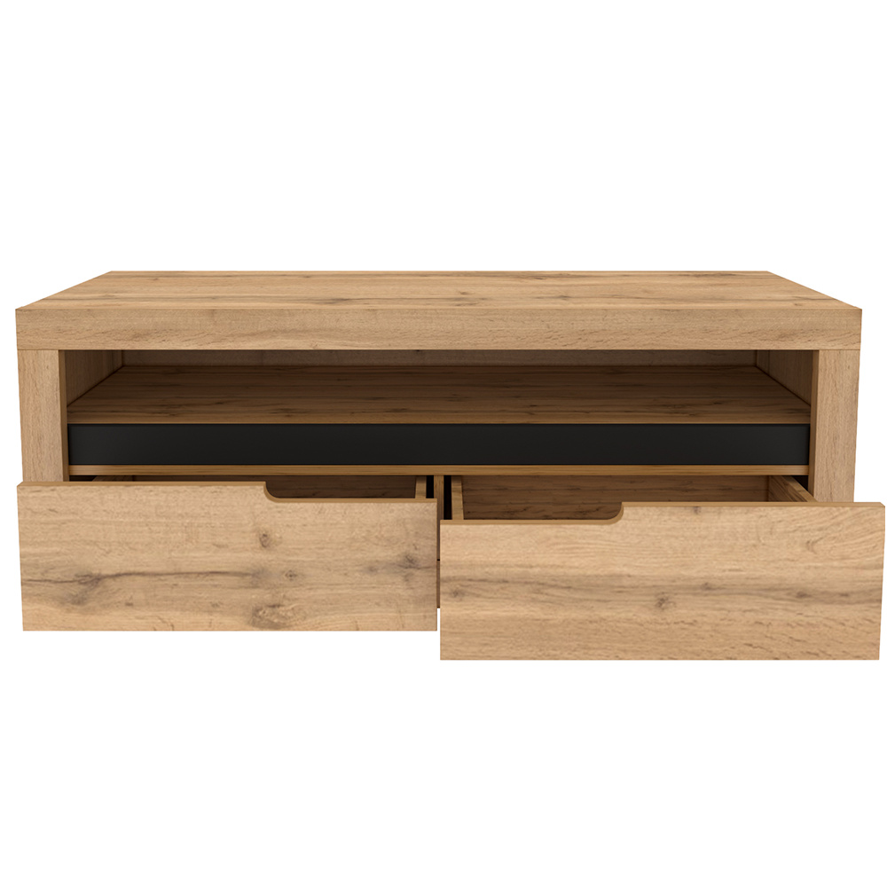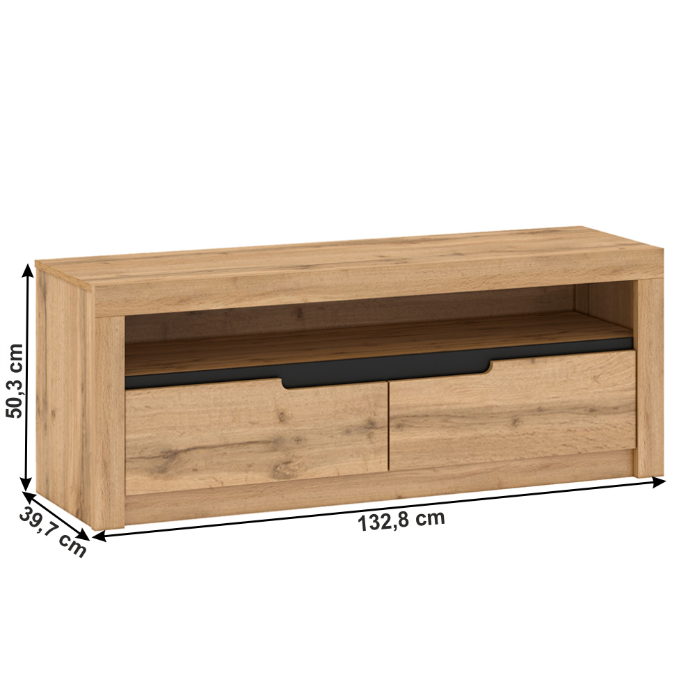 Materiál: DTD laminovaná / MDF fóliovaná Barva: dub Wotan Rozměry (ŠxHxV): 132,8x39,7x50,3 cm Tloušťka materiálu korpus: 16 mm dva šuplíky Otevřený úložný prostor Dodávané v demontu