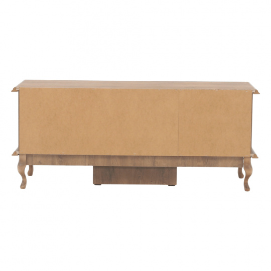 Materiál: DTD laminovaná / ABS hrany Barva: dub lefkas Rozměry (ŠxHxV): 144x47x60 cm Výška spodního prostoru od podlahy: 15 cm Tloušťka materiálu: 30 mm dva šuplíky Dvě jednodveřové skříňky police 3D efekt kovové úchytky Dřevěné nožičky ABS hrany barokní styl
