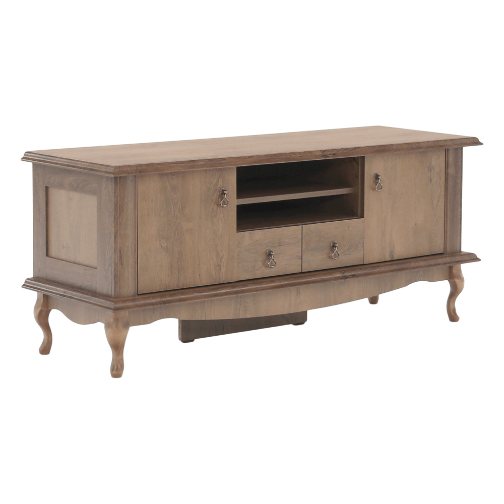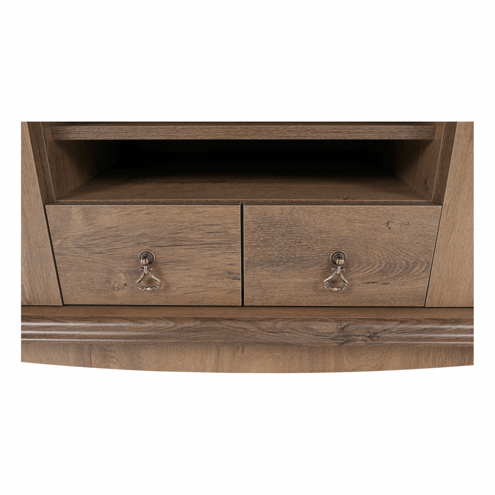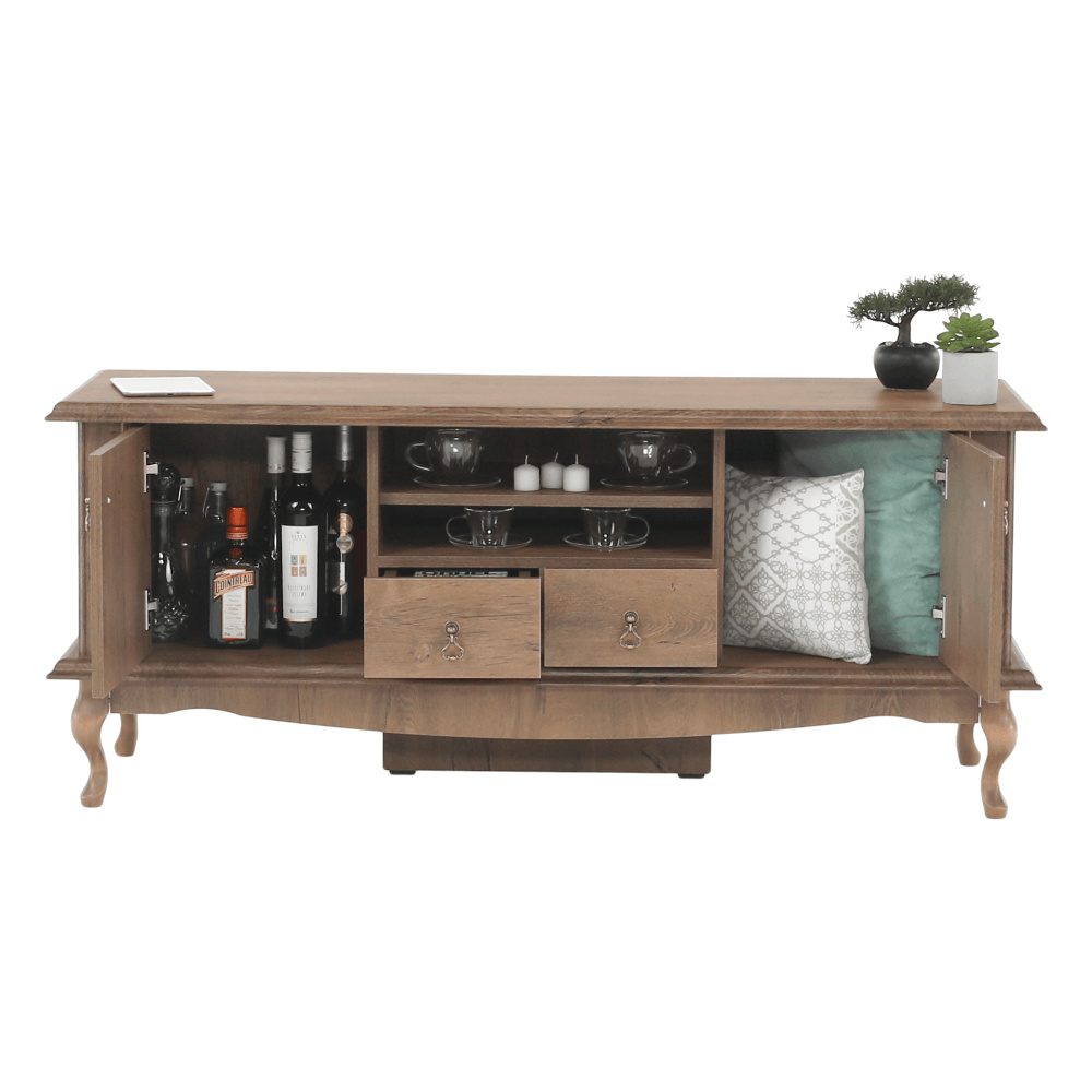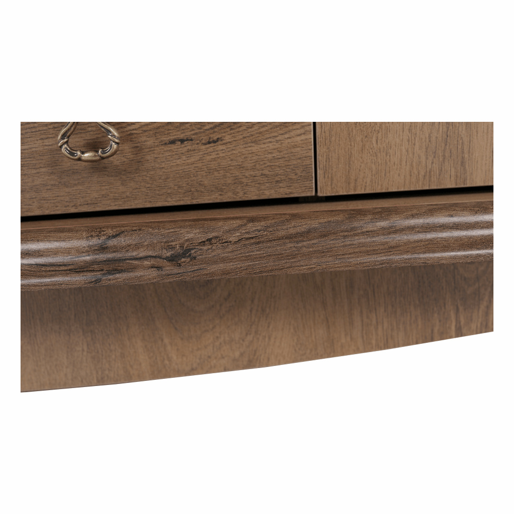 Materiál: DTD laminovaná / ABS hrany Barva: dub lefkas Rozměry (ŠxHxV): 144x47x60 cm Výška spodního prostoru od podlahy: 15 cm Tloušťka materiálu: 30 mm dva šuplíky Dvě jednodveřové skříňky police 3D efekt kovové úchytky Dřevěné nožičky ABS hrany barokní styl