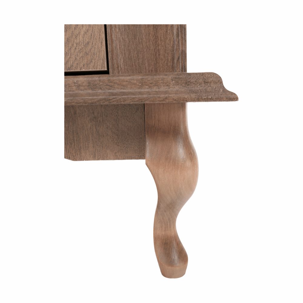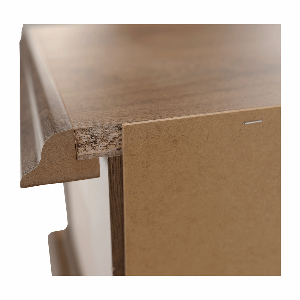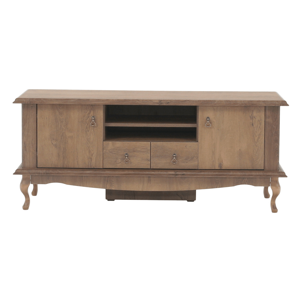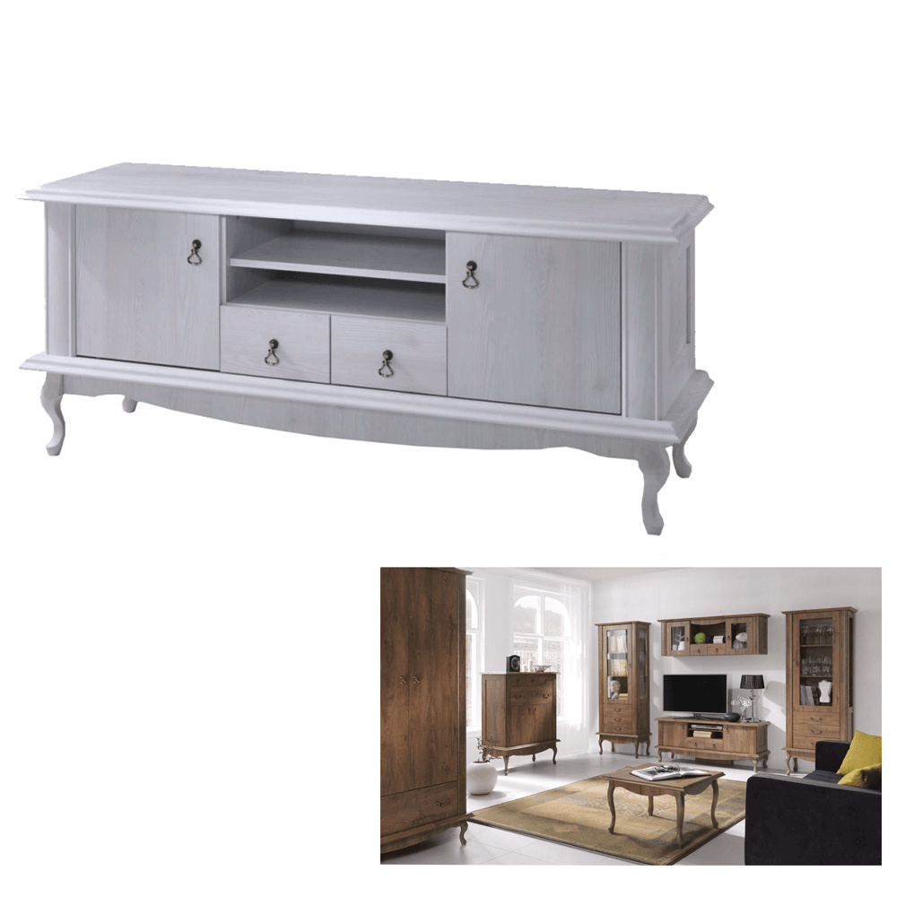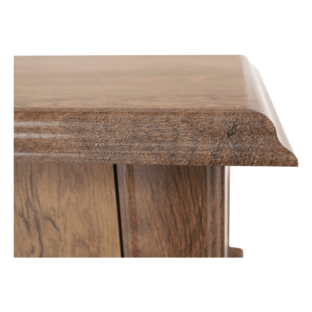 Materiál: DTD laminovaná / ABS hrany Barva: dub lefkas Rozměry (ŠxHxV): 144x47x60 cm Výška spodního prostoru od podlahy: 15 cm Tloušťka materiálu: 30 mm dva šuplíky Dvě jednodveřové skříňky police 3D efekt kovové úchytky Dřevěné nožičky ABS hrany barokní styl