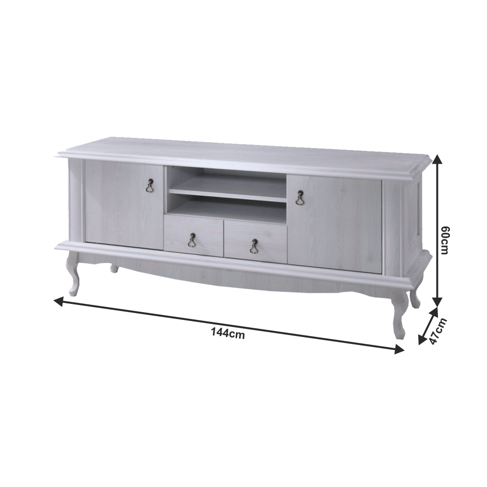 Materiál: DTD laminovaná / ABS hrany Barva: sosna bílá Rozměry (ŠxHxV): 144x47x60 cm Výška spodního prostoru od podlahy: 15 cm Tloušťka materiálu: 30 mm dva šuplíky Dvě jednodveřové skříňky police 3D efekt kovové úchytky Dřevěné nožičky ABS hrany barokní styl