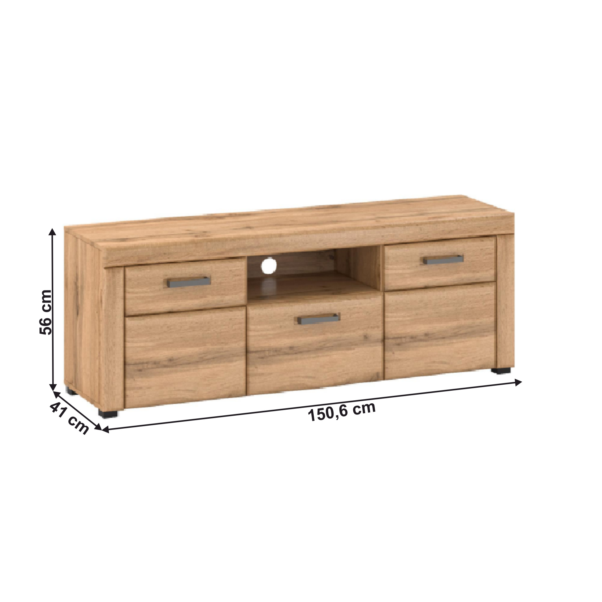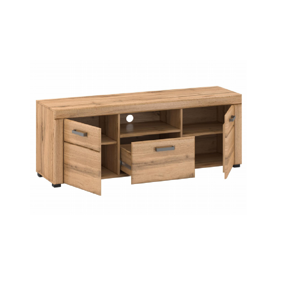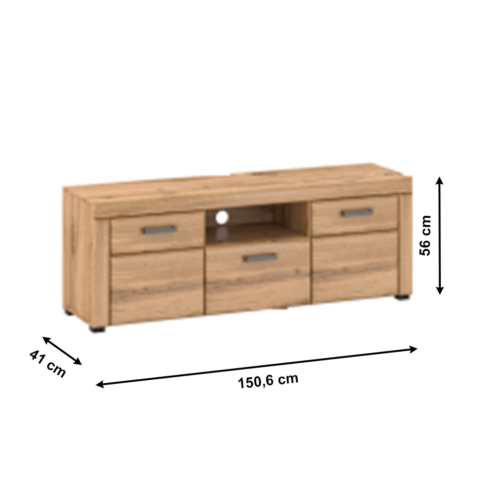 Materiál: laminovaná DTD / MDF fóliovaná/kov Barevné provedení: dub apalačský Rozměry (ŠxHxV): 150,6x41x56 cm Tloušťka materiálu: 1,9 cm S kovovými úchyty dvoudveřový Jedna otevřená police Čtyři uzavřené police jeden šuplík elegantní nožičky Nosnost police: 5 kg Výška spodního prostoru od podlahy: 2,5 cm Moderní retro styl kvalitní zpracování Dodávané v demontu