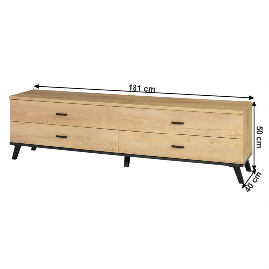 Materiál: DTD laminovaná / plast Barva: dub lefkas / černá Rozměry (ŠxHxV): 181x40x50 cm RTV stolek čtyři šuplíků Výška spodního prostoru od podlahy: 12 cm plastové nožičky ABS hrany moderní styl Dodávané v demontu