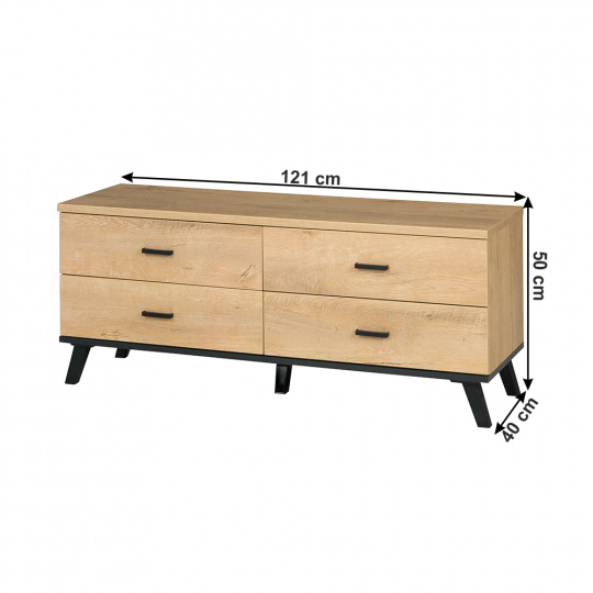 Materiál: DTD laminovaná / plast Barva: dub lefkas / černá Rozměry (ŠxHxV): 121x40x50 cm RTV stolek čtyři šuplíků Výška spodního prostoru od podlahy: 12 cm plastové nožičky ABS hrany moderní styl Dodávané v demontu