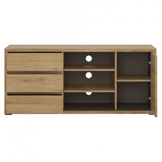 Materiál: laminovaná DTD Barevné provedení: dub Shetland/šedá Rozměry (ŠxHxV): 136x40x59,3 cm Tloušťka korpusu: 2,8 cm bez úchytová Jednoduchý a elegantní hrubý korpus 1-dveřový 3 poličky 3 šuplíky 3 otvory na kabel moderní styl vysoká kvalita precizní zpracování S nožičkami Odolný vůči poškrábání, UV záření, vysokým teplotám Nosnost poličky: 5 kg Nosnost šuplíku: 5 kg Dodávané v demontu