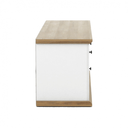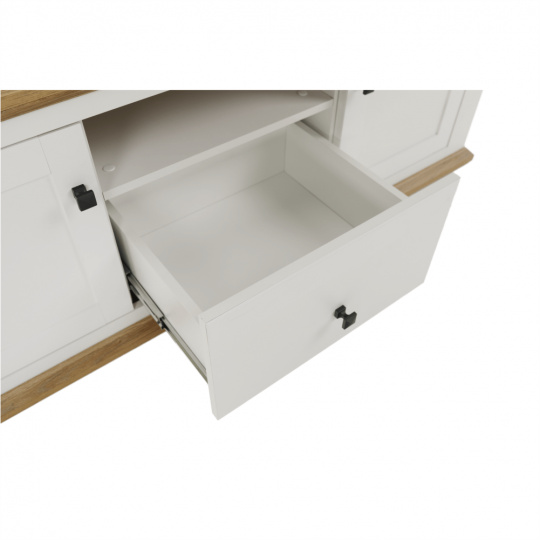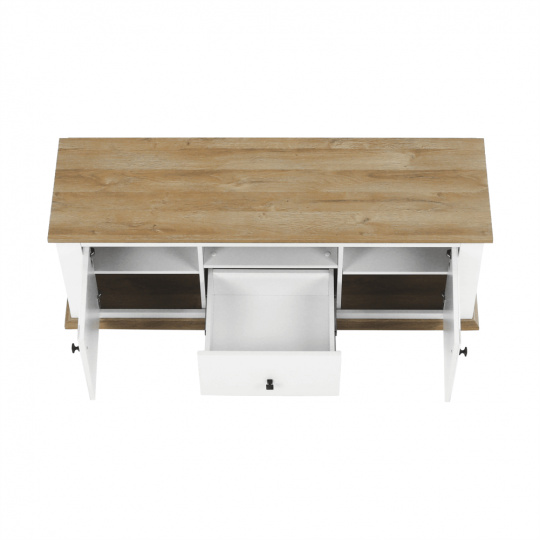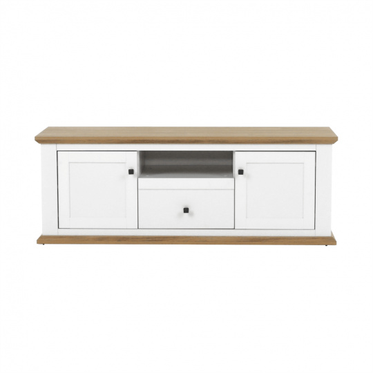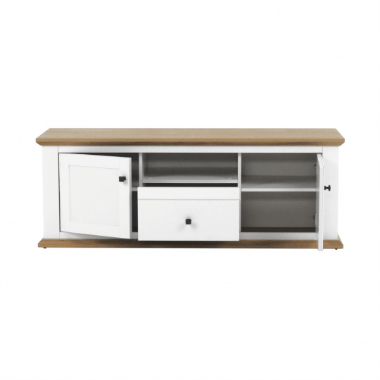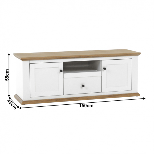 Materiál: DTD laminovaná / ABS hrany Barva: bílá / dub grand Rozměry (ŠxHxV): 150x40x55 cm Tloušťka materiálu: 40 mm dvoudveřová dvě skříňky Jeden šuplík S úchytkami S 3D efektem elegantní V provensálském stylu kovové úchytky Dodávané v demontu
