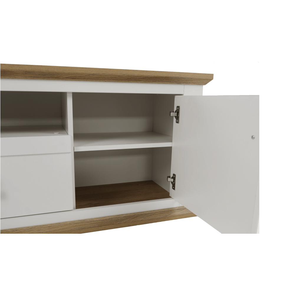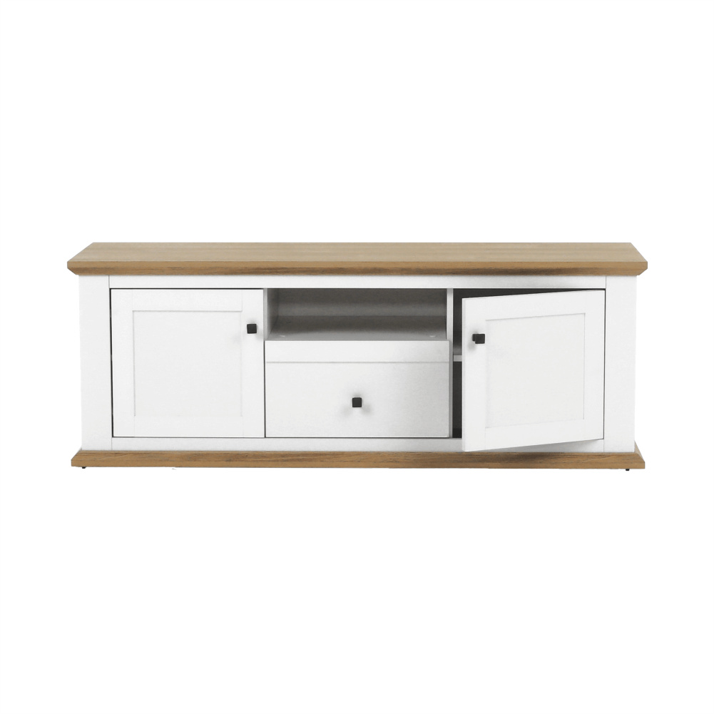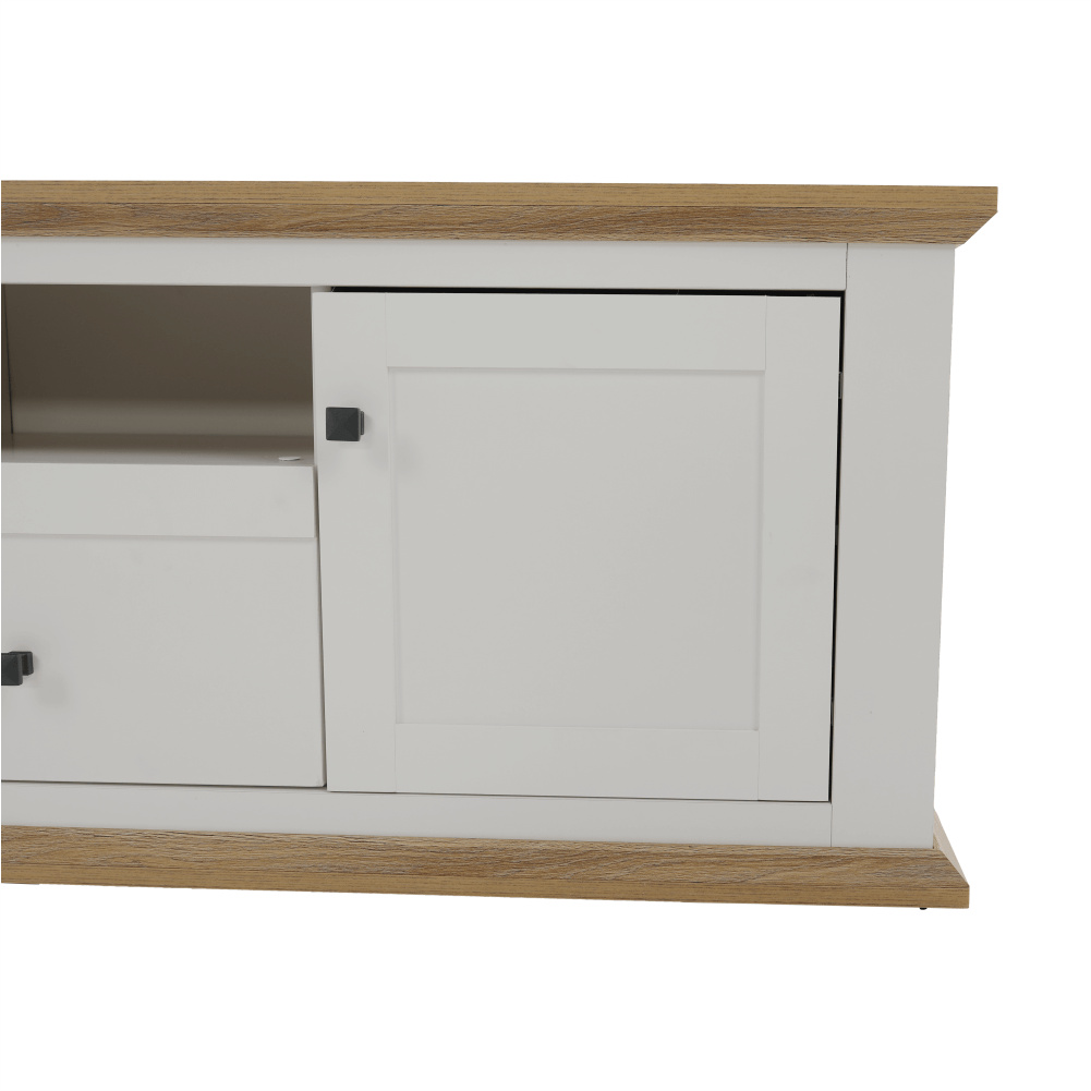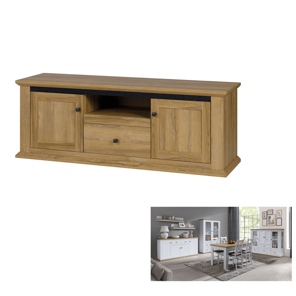 Materiál: DTD laminovaná / ABS hrany Barva: bílá / dub grand Rozměry (ŠxHxV): 150x40x55 cm Tloušťka materiálu: 40 mm dvoudveřová dvě skříňky Jeden šuplík S úchytkami S 3D efektem elegantní V provensálském stylu kovové úchytky Dodávané v demontu