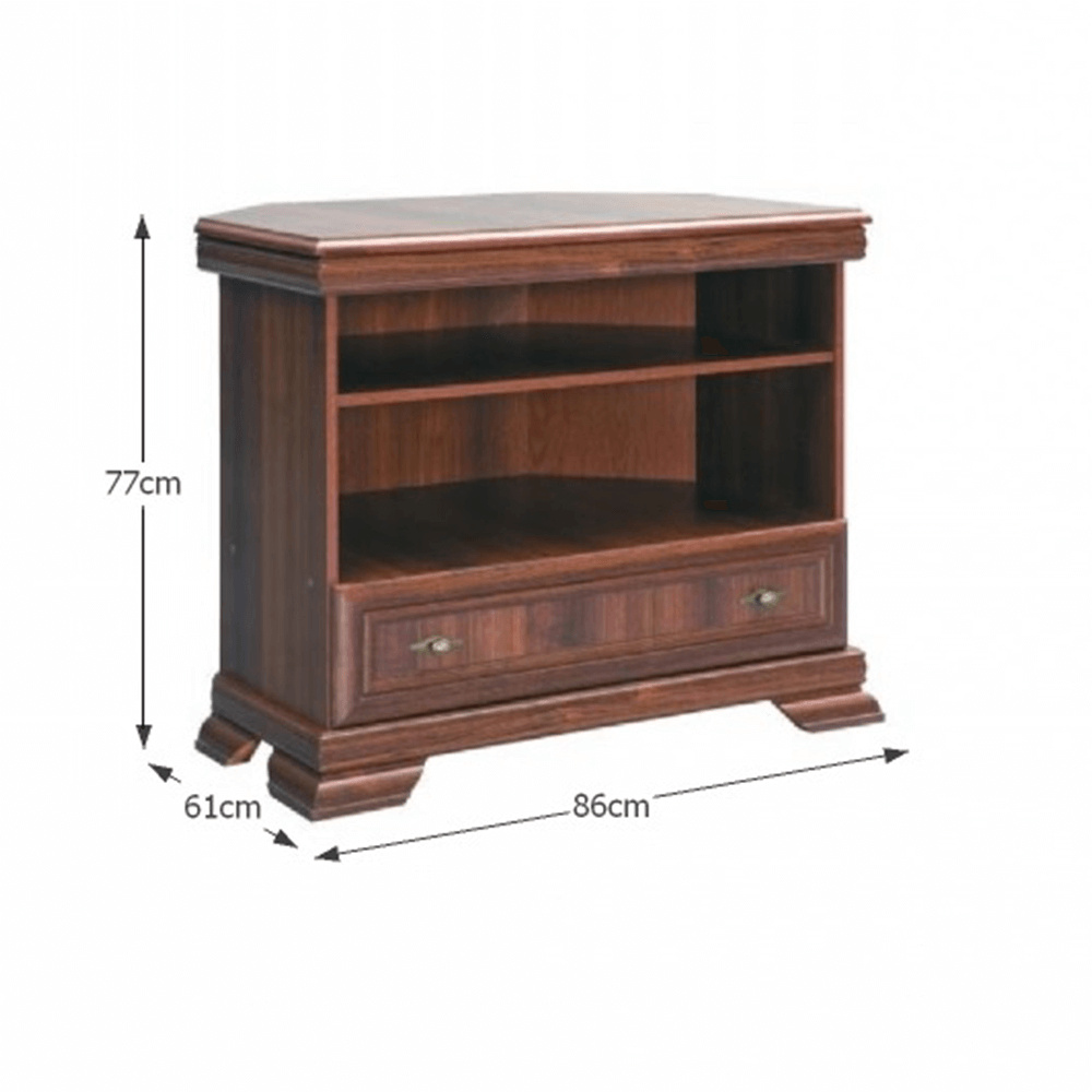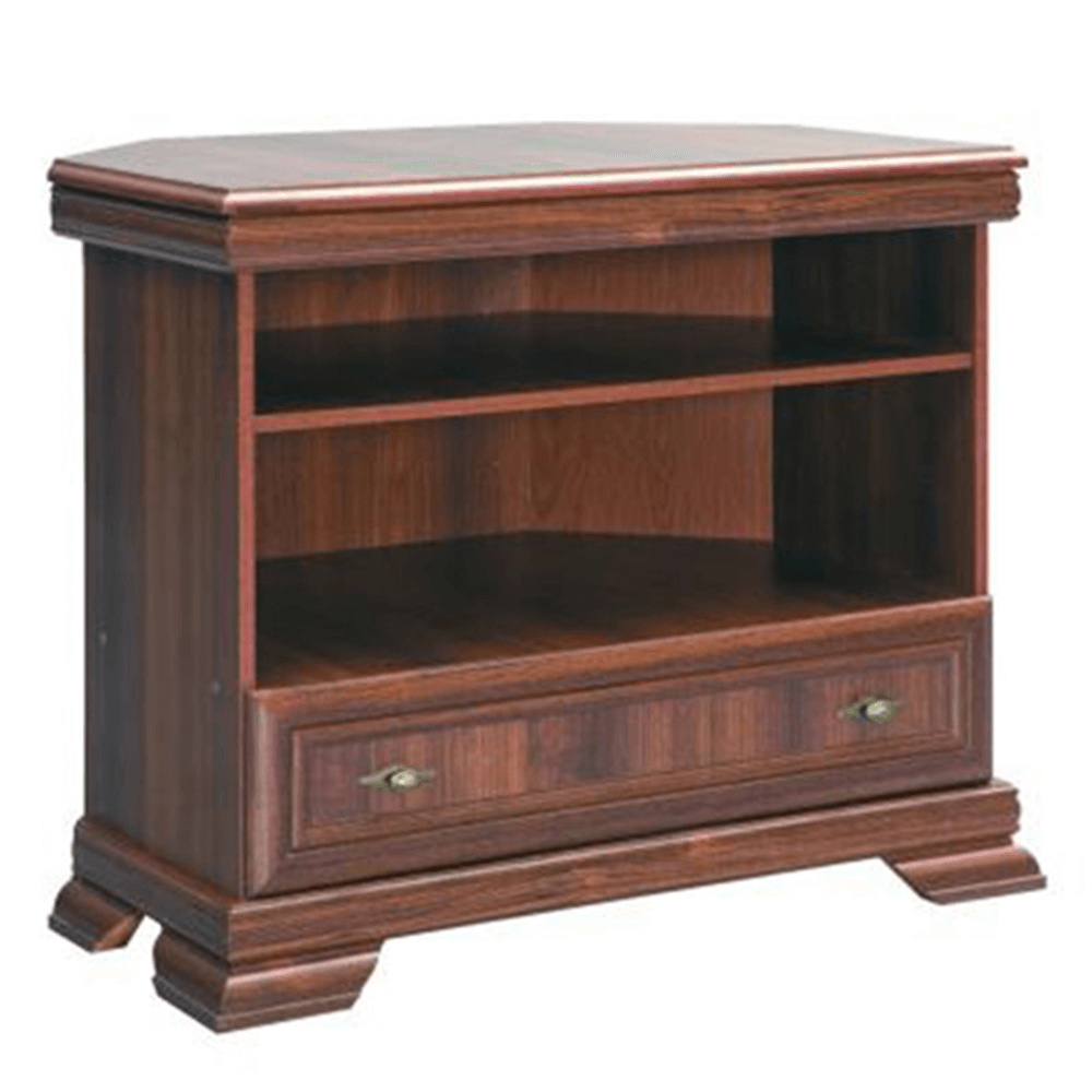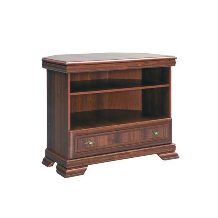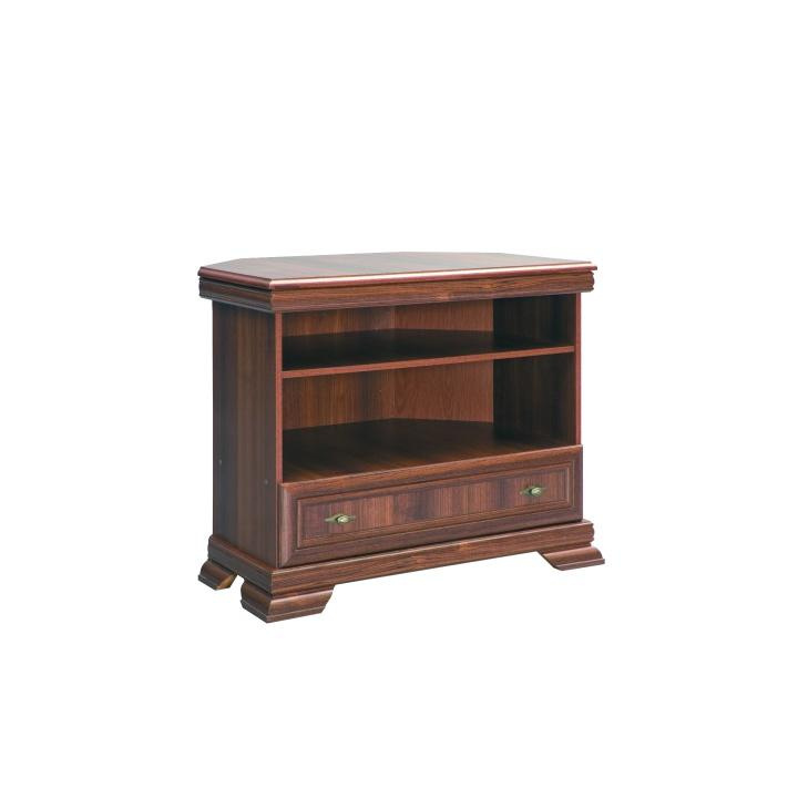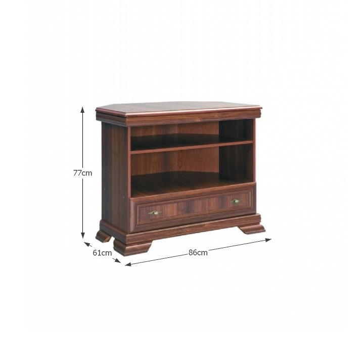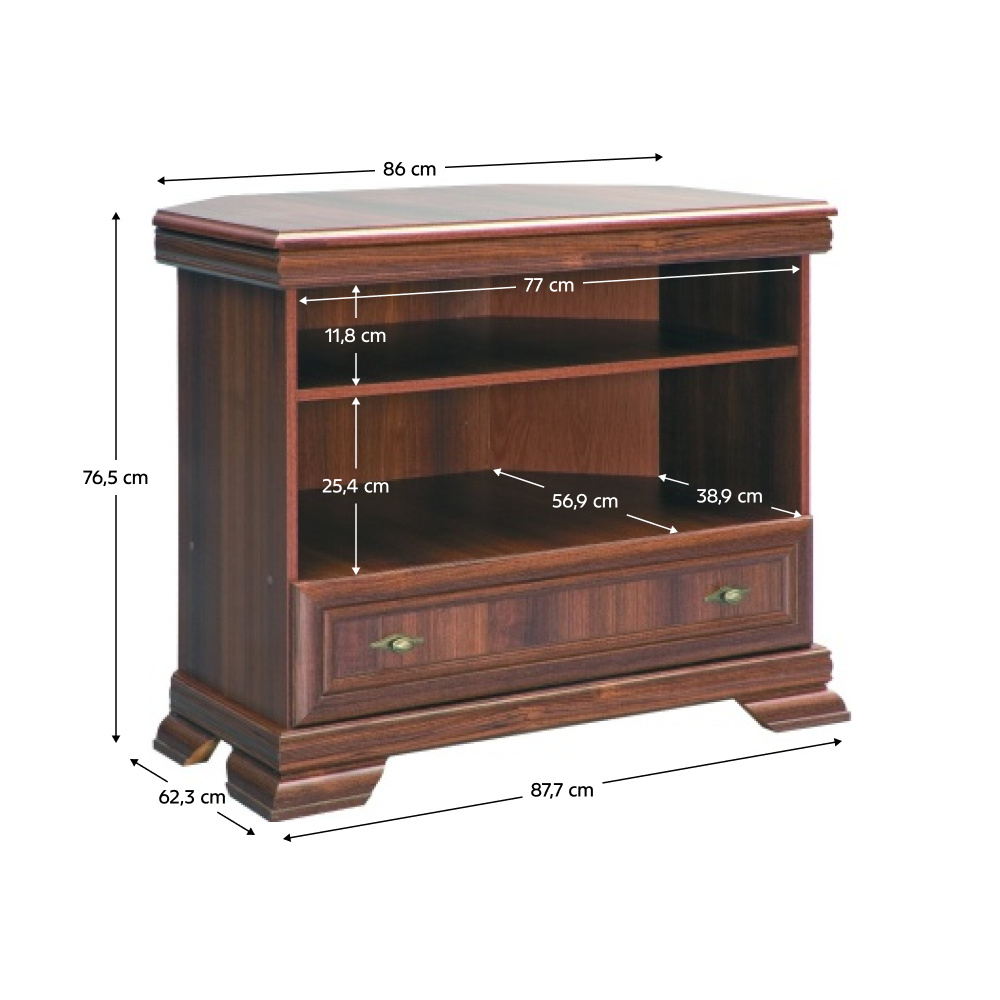Rohový RTV stolek KORA KRTN Materiál: laminovaná DTD, MDF, kov Barevné provedení: samoa king. Rozměry (ŠxHxV): 87,7x62,3x76,5 cm Tloušťka materiálu korpus: 15 mm Tloušťka materiálu vrchní desky: 22 mm Tloušťka materiálu dolní desky: 22 mm Výška spodního prostoru od podlahy: 10,5 cm Dodávané v demontu.