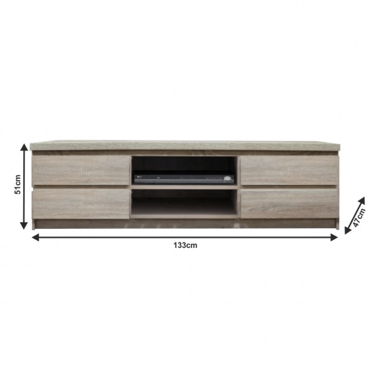 RTV stolek čtyřzásuvková, TYP 06. Materiál: DTD laminovaná, ABS hrany. Barevné provedení: dub sonoma. Rozměry ŠxHxV: 133x47x51 cm. Tloušťka materiálu korpus: 16 mm Tloušťka materiálu vrchní desky: 25 mm Dodávané v demontu.