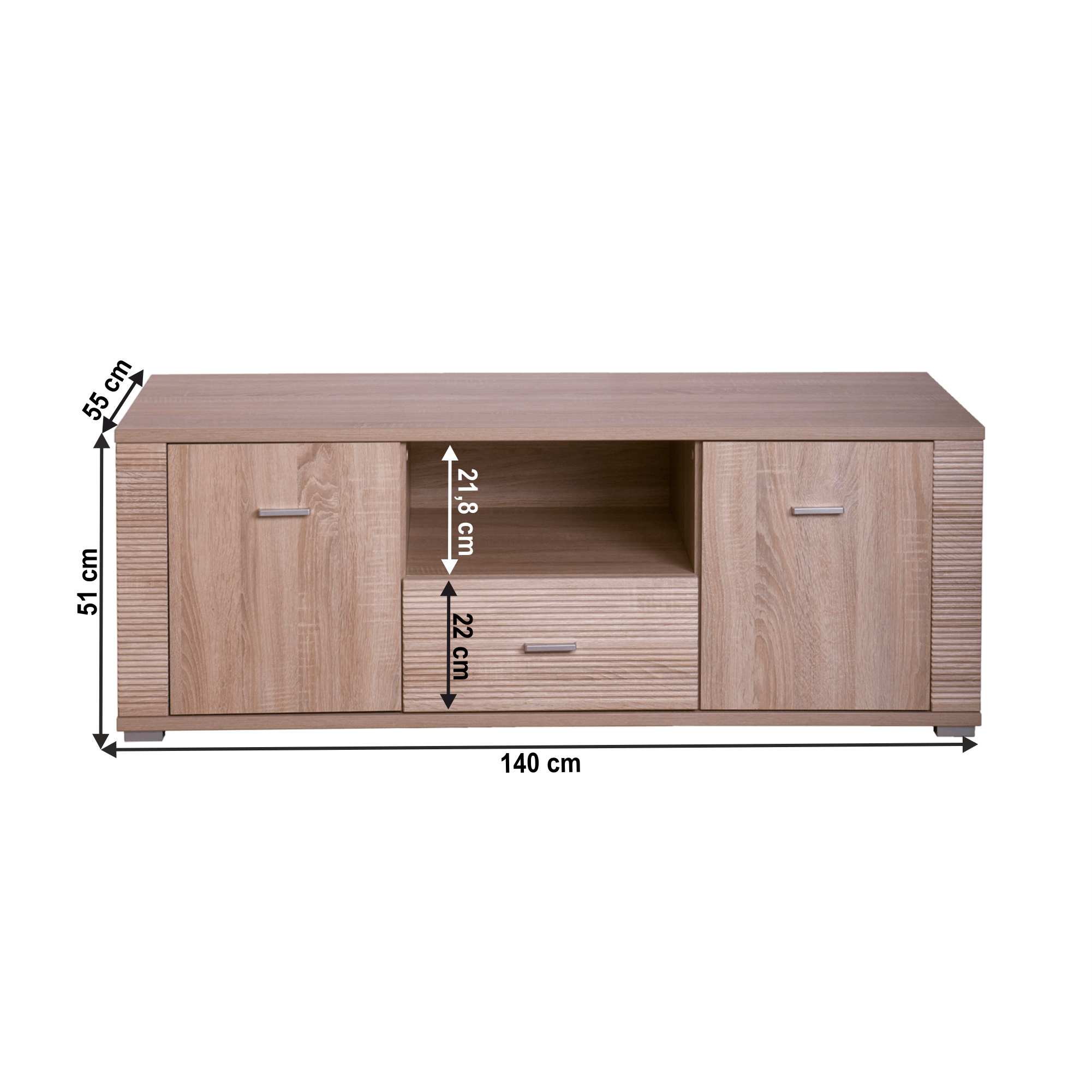 RTV stolek typ 13, dvoudveřový s jednou zásuvkou, vhodný na zařízení obývacích pokojů, ložnic i pracoven, materiál: DTD laminovaná. Hrany jednotlivých komponentů jsou ukončeny vroubkovanou lištou. Barevné provedení: dub sonoma. Rozměry (ŠxVxH): 140x51x55 cm. Tloušťka materiálu korpus: 16 mm Tloušťka materiálu vrchní desky: 22 mm Tloušťka materiálu spodní desky: 22 mm Dodávána v demontu, skladem - ihned k odběru.