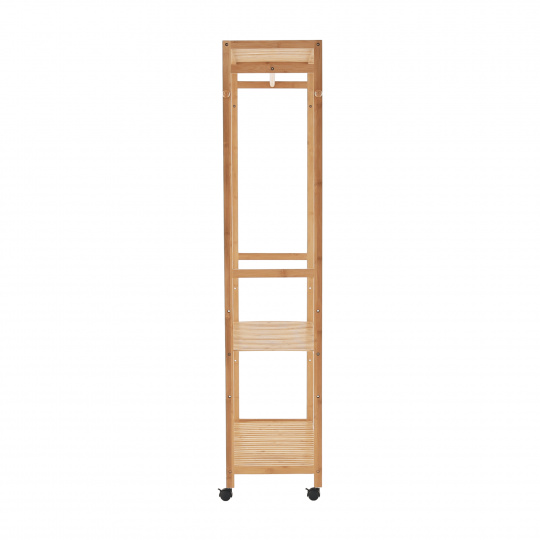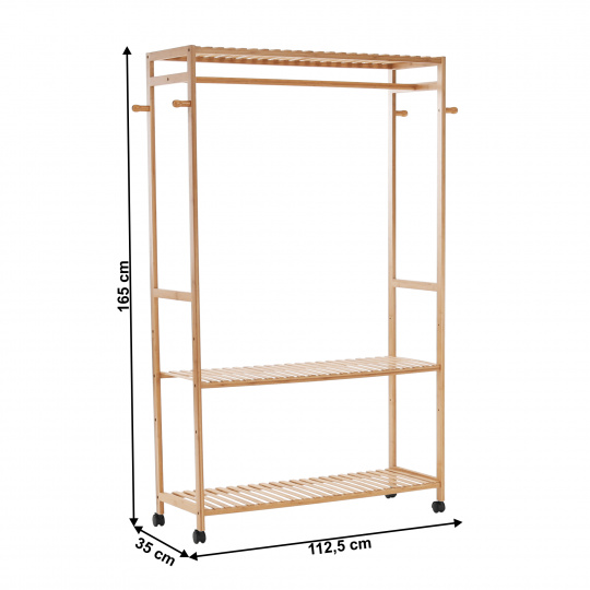 Materiál: lakovaný bambus Barva: přírodní Rozměry (ŠxHxV): 112,5x35x165 cm 3 police věšáková tyč Police z bambusu 4 háčky na doplňky Tloušťka konstrukce: 1,8x3 cm Tloušťka polic: 3 cm Průměr věšákové tyče: 2,2 cm S kolečky praktický funkční mobilní samostatně stojící přírodní design Nosnost: 10 kg Dodávané v demontu