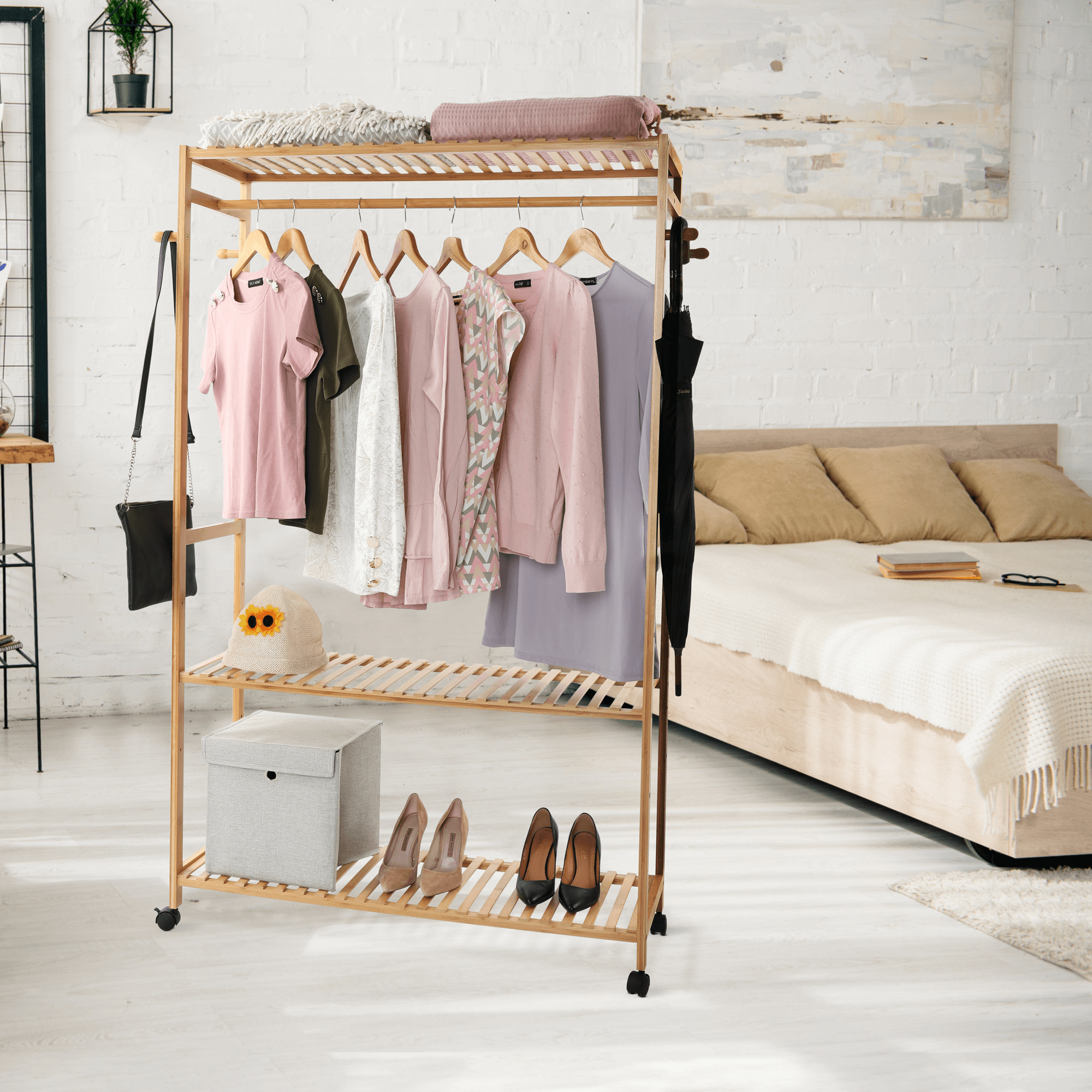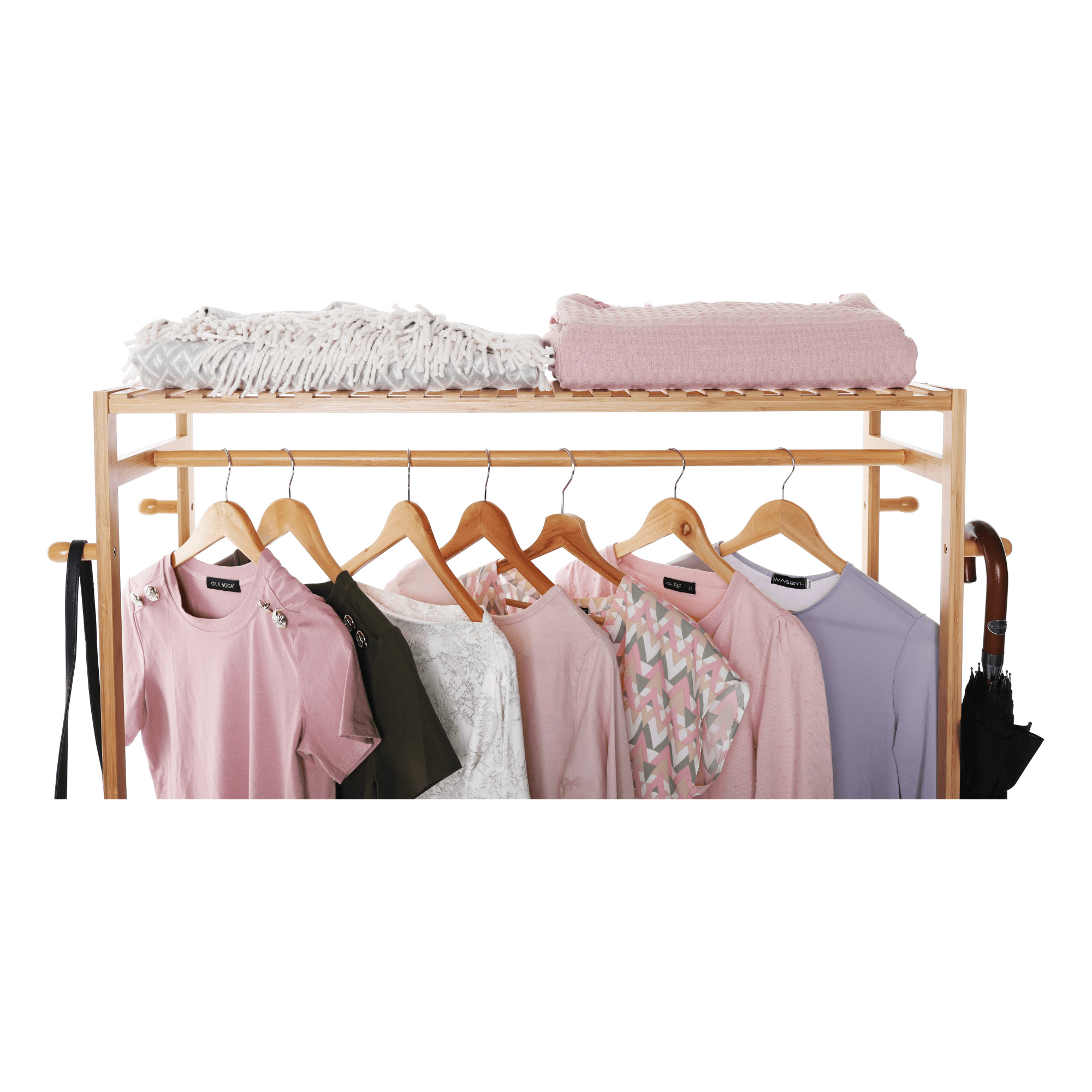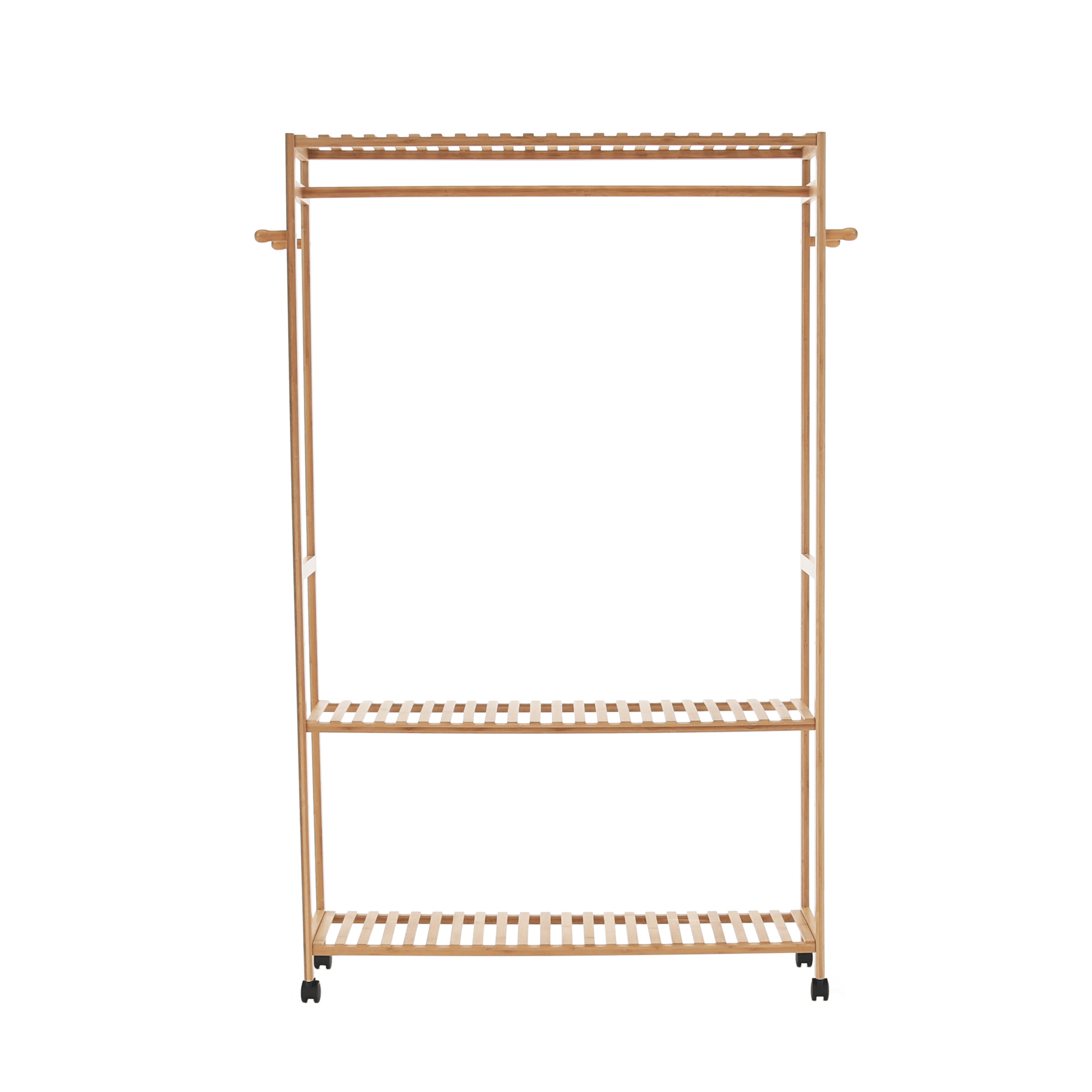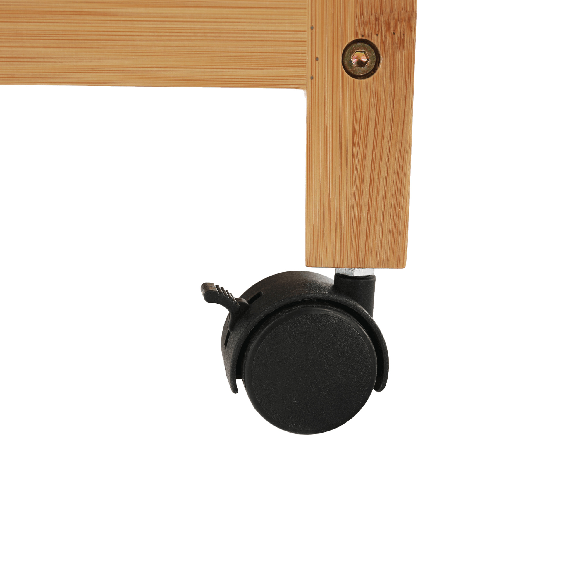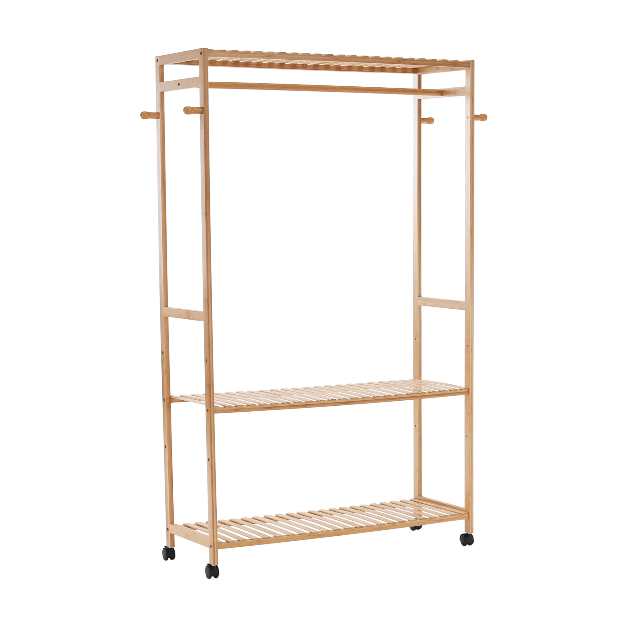 Materiál: lakovaný bambus Barva: přírodní Rozměry (ŠxHxV): 112,5x35x165 cm 3 police věšáková tyč Police z bambusu 4 háčky na doplňky Tloušťka konstrukce: 1,8x3 cm Tloušťka polic: 3 cm Průměr věšákové tyče: 2,2 cm S kolečky praktický funkční mobilní samostatně stojící přírodní design Nosnost: 10 kg Dodávané v demontu