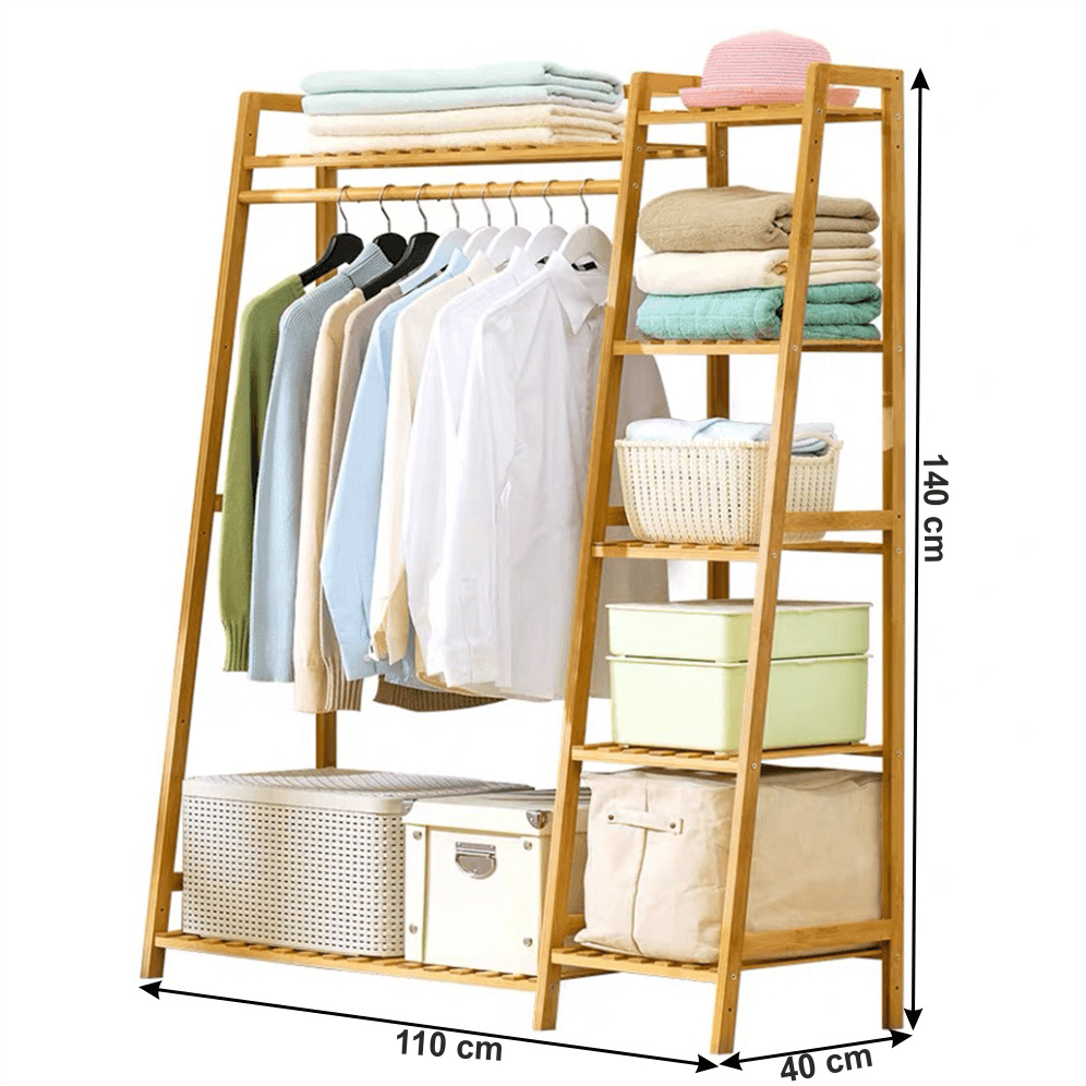 Materiál: lakovaný bambus Barva: přírodní Rozměry (ŠxHxV): 110x40x140 cm 7 polic věšáková tyč Nosnost na jednu polici: 10 kg Je univerzální, policovou část můžete mít na pravé nebo na levé straně Dodávané v demontu