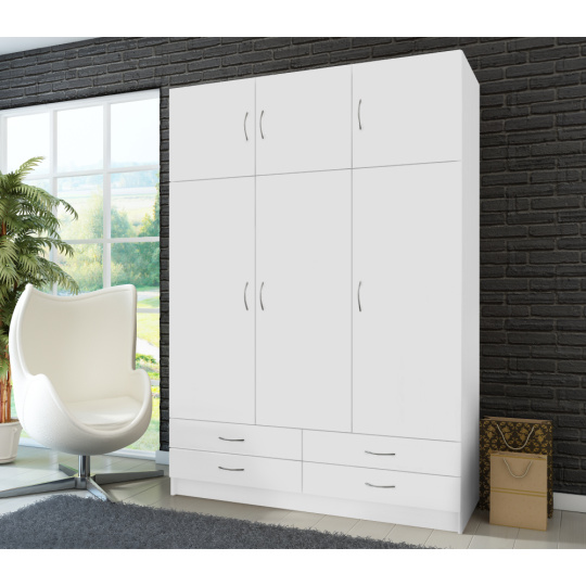 Materiál: DTD laminovaná Barva: bílá Rozměry (ŠxHxV): 135,1x54,6x194 cm Rozměry šuplíku (ŠxV): 67,1x14,6 cm Třídveřová Čtyři šuplíky Nosnost šuplíku: 3 kg S nástavci Policová Nosnost police: 5 kg Věšáková Nosnost věšákové tyče: 10 kg Kovové úchytky Dodáváno v demontu