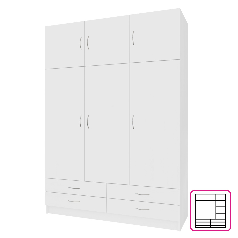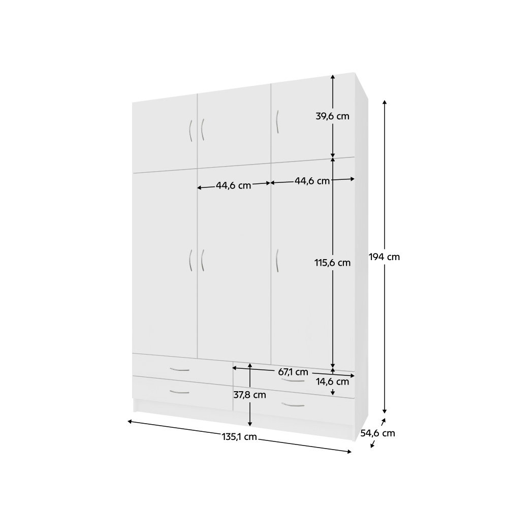 Materiál: DTD laminovaná Barva: bílá Rozměry (ŠxHxV): 135,1x54,6x194 cm Rozměry šuplíku (ŠxV): 67,1x14,6 cm Třídveřová Čtyři šuplíky Nosnost šuplíku: 3 kg S nástavci Policová Nosnost police: 5 kg Věšáková Nosnost věšákové tyče: 10 kg Kovové úchytky Dodáváno v demontu