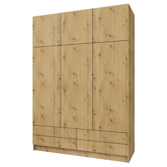 Materiál: DTD laminovaná Barva: dub artisan Rozměry (ŠxHxV): 135,1x54,6x194 cm Rozměry šuplíku (ŠxV): 67,1x14,6 cm Třídveřová Čtyři šuplíky Nosnost šuplíku: 3 kg S nástavci Policová Nosnost police: 5 kg Věšáková Nosnost věšákové tyče: 10 kg Kovové úchytky Dodáváno v demontu