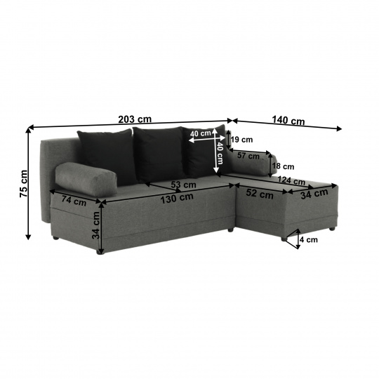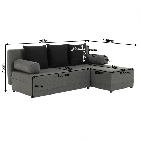 Materiál: látka Oděruodolnost textilie podle testu Martindale: 59 000 oděrů Barva: šedá/černá Rozměry: ŠxHxV: 203x140x75 cm Plocha na spaní: ŠxD: 127x203 cm Výška sedu: 37 cm Hloubka sedu: 53/74 cm Výška spodního prostoru od podlahy: 4 cm Polštář (ŠxV): 40x40 cm 3+2 polštáře Nosnost na osobu: 90 kg Tři opěrkové polštáře Dva polštáře zastupující opěrky na ruce Rohová Pravé provedení Výplň: molitán S úložným prostorem Dekorativní šití Dodávána v demontu Možnost objednání z vyobrazených barevných provedení v ceně 13.790 Kč.Při individuální objednávce je třeba zaplatit 20% zálohu z dané částky. Po uhrazení zálohy bude Vaša objednávka zadána do výroby. Doba dodání 6-8 týdnů.