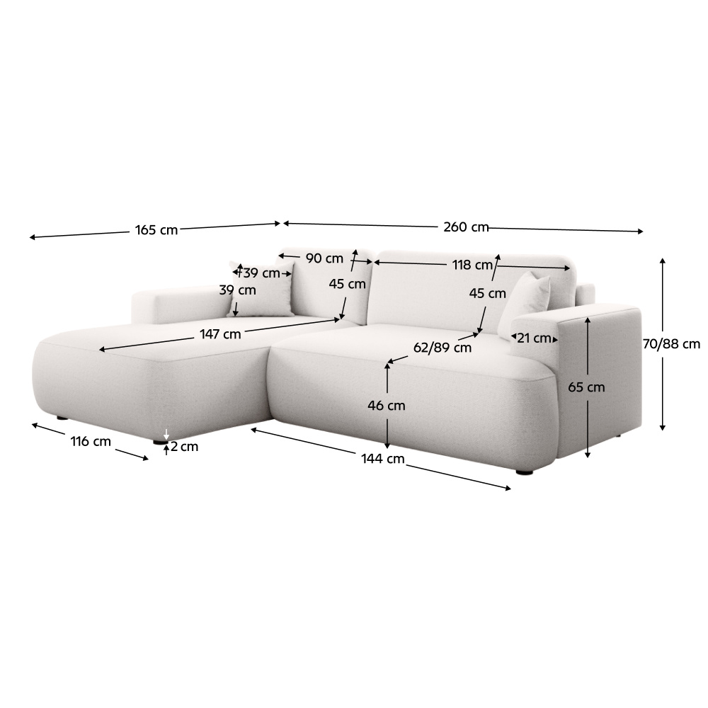 Materiál čalounění: látka Lambi 07 Oděruodolnost látky podle testu Martindale: 50 000 oděrů Barva čalounění: bílá Rozměry (ŠxHxV): 260x165x70/88 cm Plocha na spaní (ŠxD): 130x215 cm Výška sedu: 46 cm Hloubka sedu: 62/89 cm Rozměry opěrky na ruku (ŠxV): 21x65 cm Rozměry otomanu (ŠxH): 116x147 cm Šířka sedáku: 144 cm Výška spodního prostoru od podlahy: 2 cm Na nožičkách Materiál nožiček: plast Výplň: bonelová pružina/HR pěna Rozkládací Rohová Celočalouněná Levé provedení Dodáváno s dekorativními polštářky S úložným prostorem Dodáváno v demontu Možnost objednání v 6 barevných odstínech látky Lambi v ceně 28.750 Kč s dodací lhůtou 6-8 týdnů. Při individuální objednávce je třeba zaplatit 20% zálohu z dané částky. Po uhrazení zálohy bude Váš požadavek zadán do výroby.