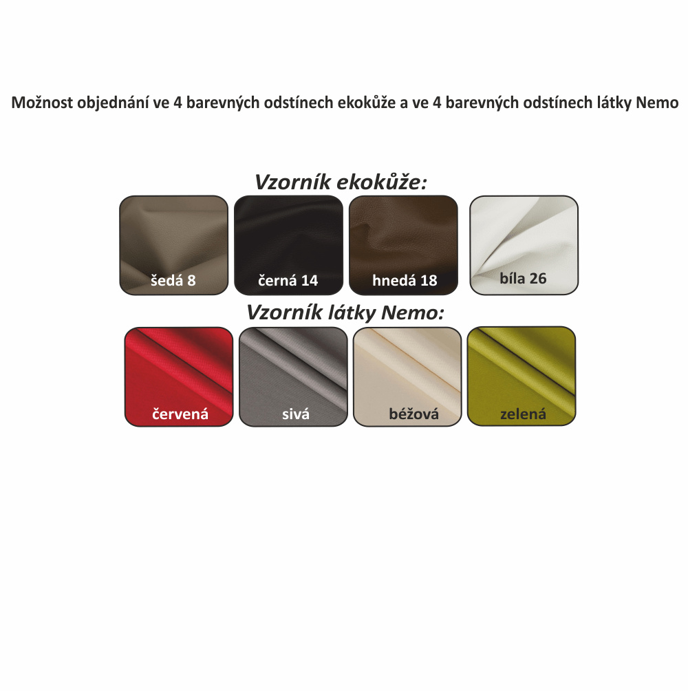 Celočalouněná, rozkládací sedací souprava ve tvaru U, levá, SANTIAGO U Materiál: ekokůže / látka Oděruodolnost textilie Matrix podle testu Martindale: 72 000 oděrek Oděruodolnost ekokůže podle testu Martindale: 100 000 oděrek Barva: černá / Matrix 19 tmavě šedá Rozměry (ŠxHxV): 325x86 / 106x168 / 217 cm Plocha na spaní (ŠxD): 116x260 cm Výška sedu: 41 cm Hloubka sedu: 53 cm Nosnost na osobu: 90 kg Výška spodního prostoru od podlahy: 10 cm Šířka volného prostoru mezi ottomany: 151 cm Manuální systém rozkladu Nosnost: 90 kg Dodávané v demontu. Možnost objednání v 6 barevných provedeních látky Matrix a v 6 provedeních ekokůže roh U v ceně 36.850 Kč, křeslo -9.890 Kč, taburet - 3.290 Kč Při individuální objednávce je třeba zaplatit 20% zálohu z dané částky. Po uhrazení zálohy bude Váš požadavek zadán do výroby. Doba dodání 6-8 týdnů. Váš výběr poznamenejte do poznámky v objednávce.