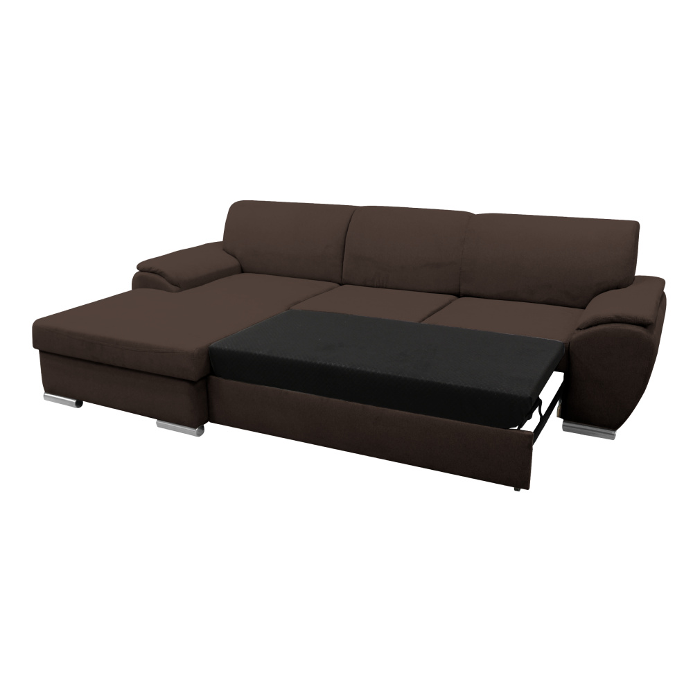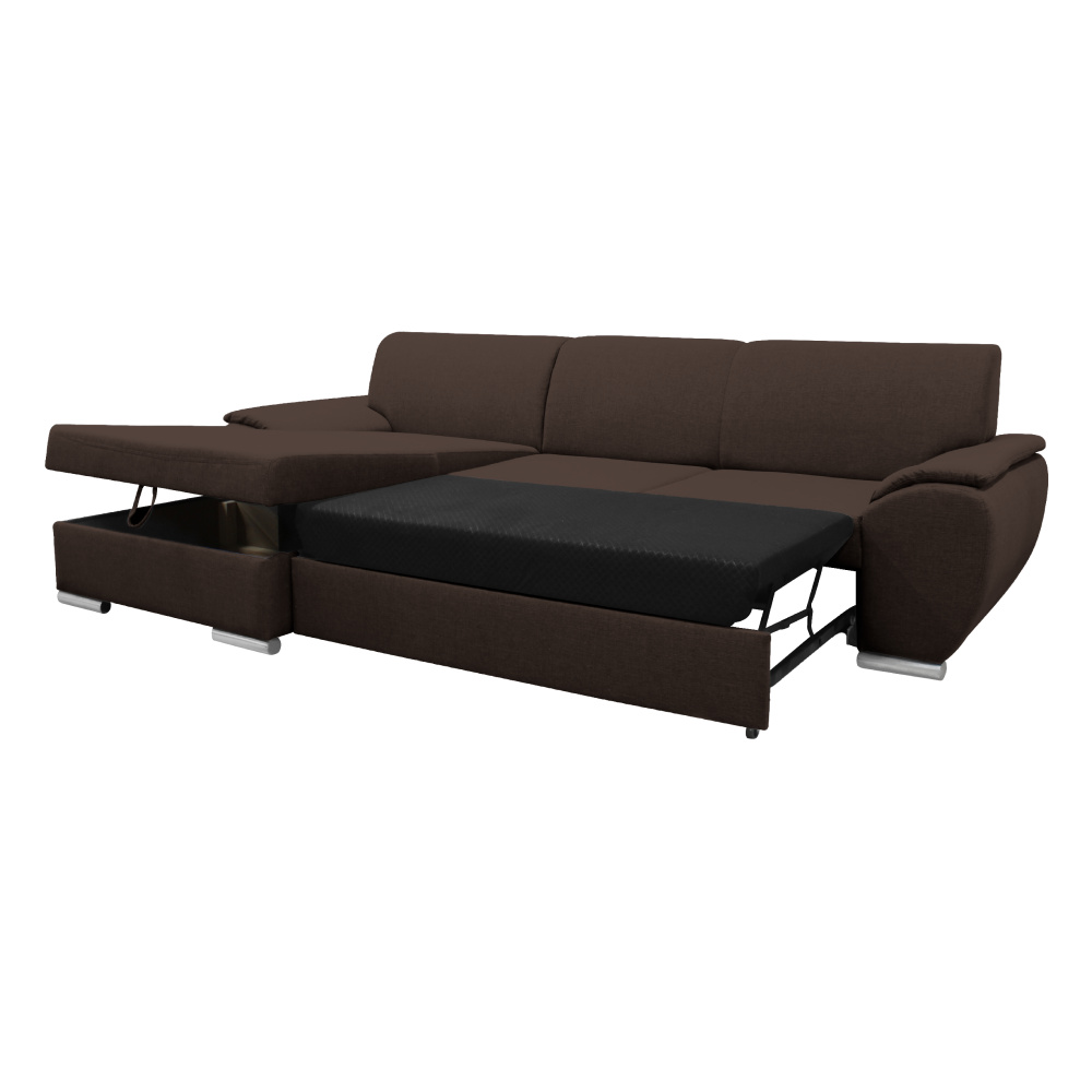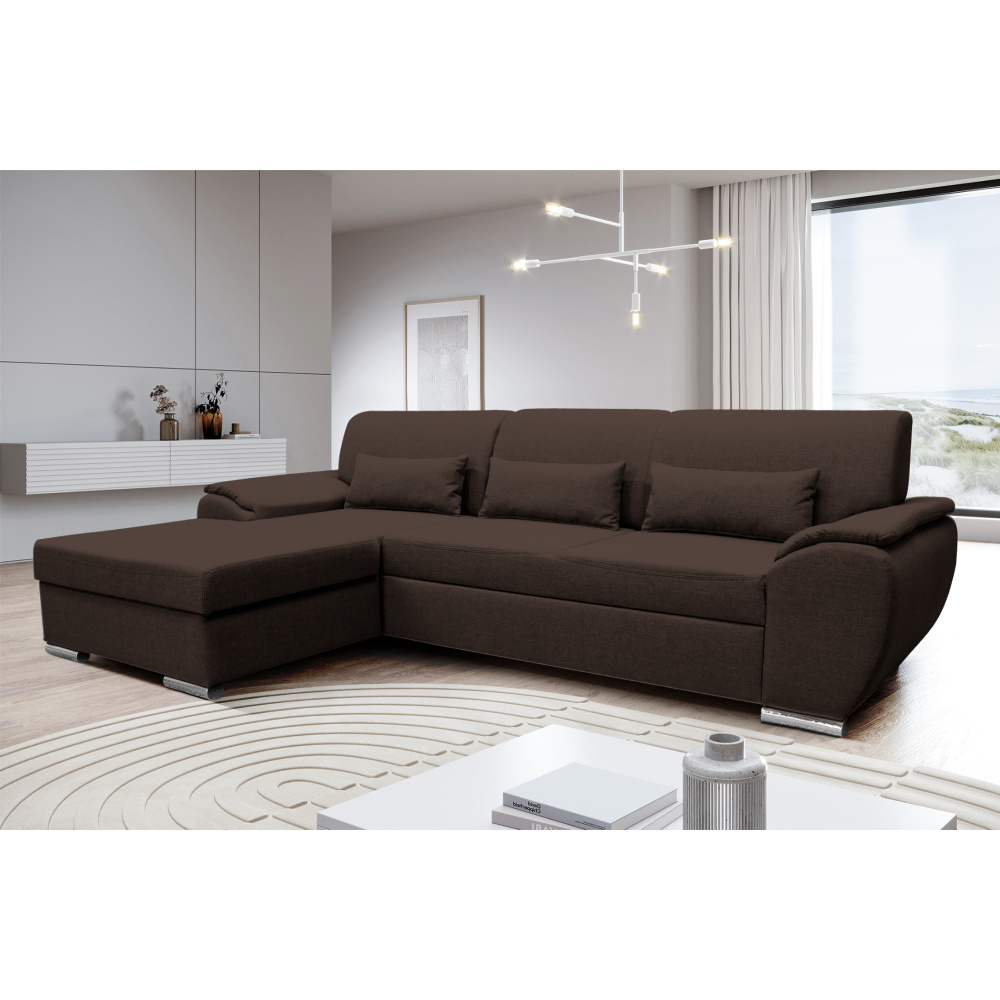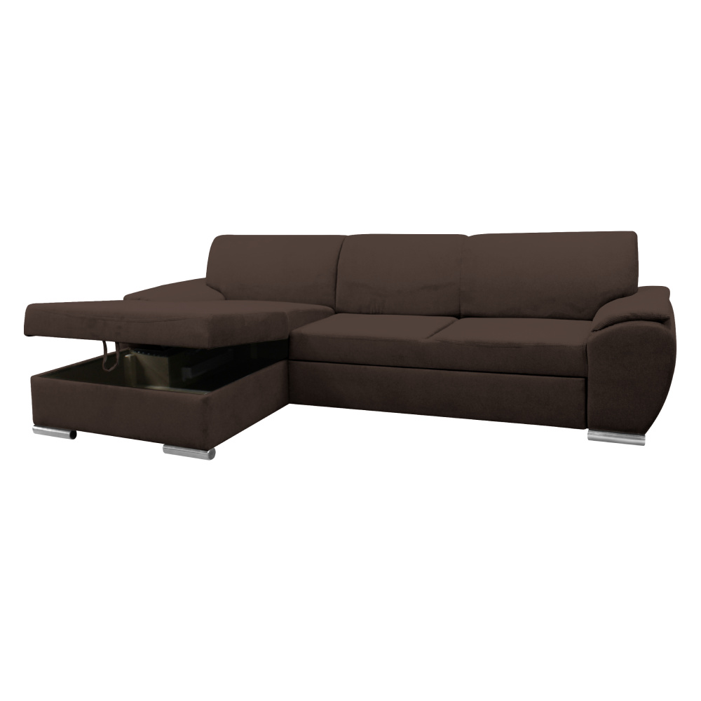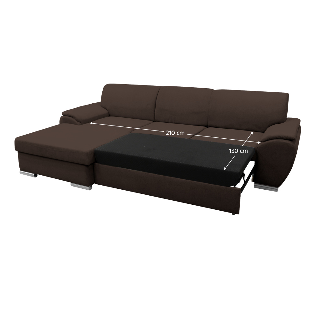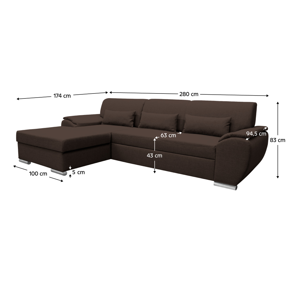 Materiál: látka Malmo 26 Oděruodolnost textilie podle testu Martindale: 30 000 oděrů Barva: hnědá Rozměry (ŠxHxV): 280x174x83 cm Plocha na spaní (ŠxD): 130x210 cm Výška sedu: 43 cm Hloubka sedu: 63 cm Výška spodního prostoru od podlahy: 5 cm Plastové nožičky Barva nožiček: stříbrná 3 dekorativní polštáře Výplň: pružina/pur pěna Celočalouněná Rohová Rozkládací S úložným prostorem Levé provedení Dodáváno v demontu