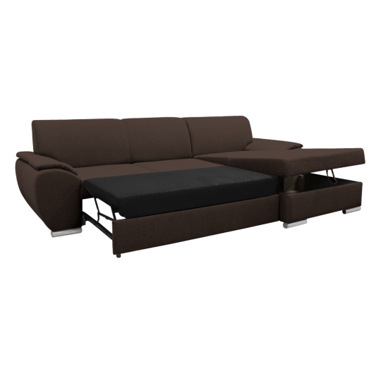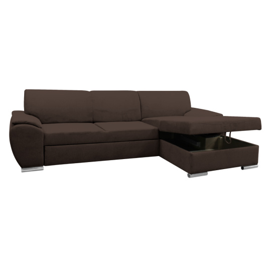 Materiál: látka Malmo 26 Oděruodolnost textilie podle testu Martindale: 30 000 oděrů Barva: hnědá Rozměry (ŠxHxV): 280x174x83 cm Plocha na spaní (ŠxD): 130x210 cm Výška sedu: 43 cm Hloubka sedu: 63 cm Výška spodního prostoru od podlahy: 5 cm Plastové nožičky Barva nožiček: stříbrná 3 dekorativní polštáře Výplň: pružina/pur pěna Celočalouněná Rohová Rozkládací S úložným prostorem Pravé provedení Dodáváno v demontu