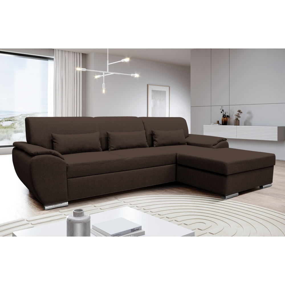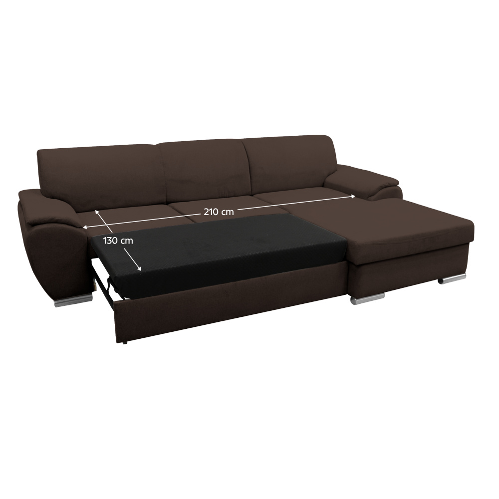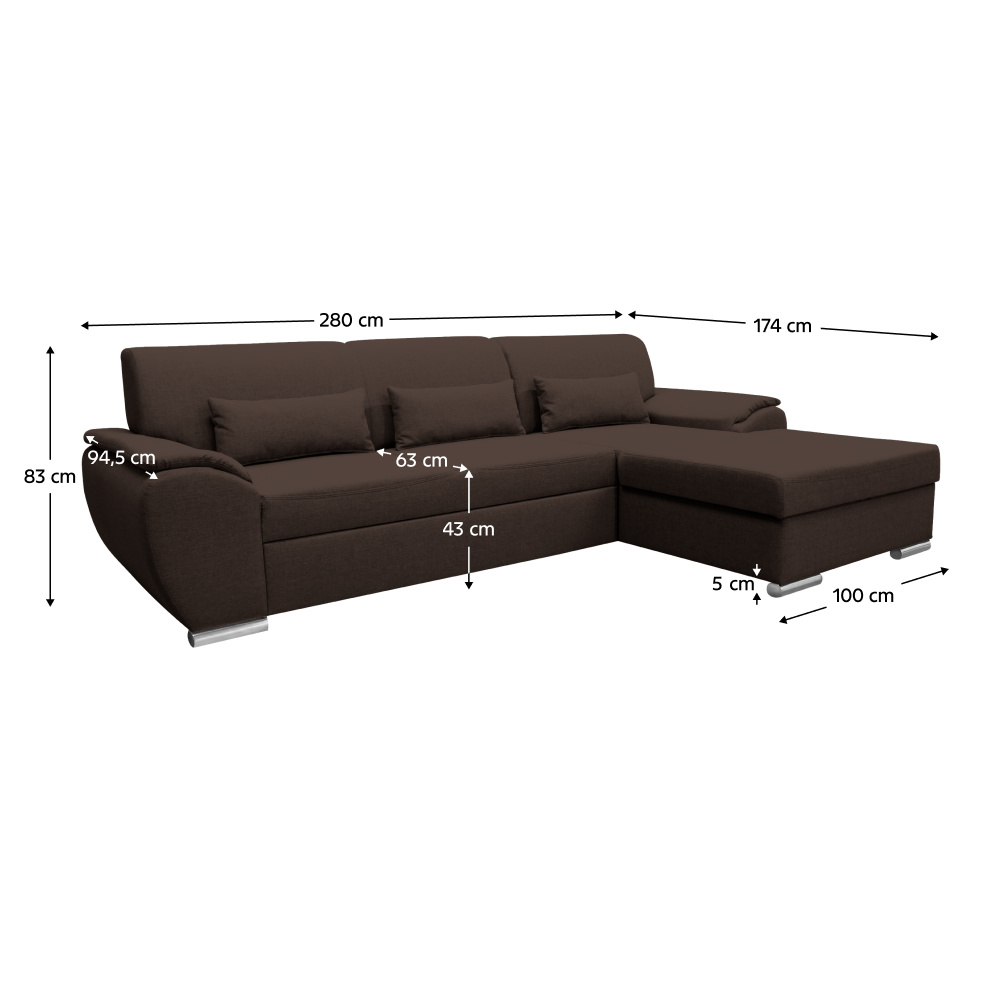 Materiál: látka Malmo 26 Oděruodolnost textilie podle testu Martindale: 30 000 oděrů Barva: hnědá Rozměry (ŠxHxV): 280x174x83 cm Plocha na spaní (ŠxD): 130x210 cm Výška sedu: 43 cm Hloubka sedu: 63 cm Výška spodního prostoru od podlahy: 5 cm Plastové nožičky Barva nožiček: stříbrná 3 dekorativní polštáře Výplň: pružina/pur pěna Celočalouněná Rohová Rozkládací S úložným prostorem Pravé provedení Dodáváno v demontu