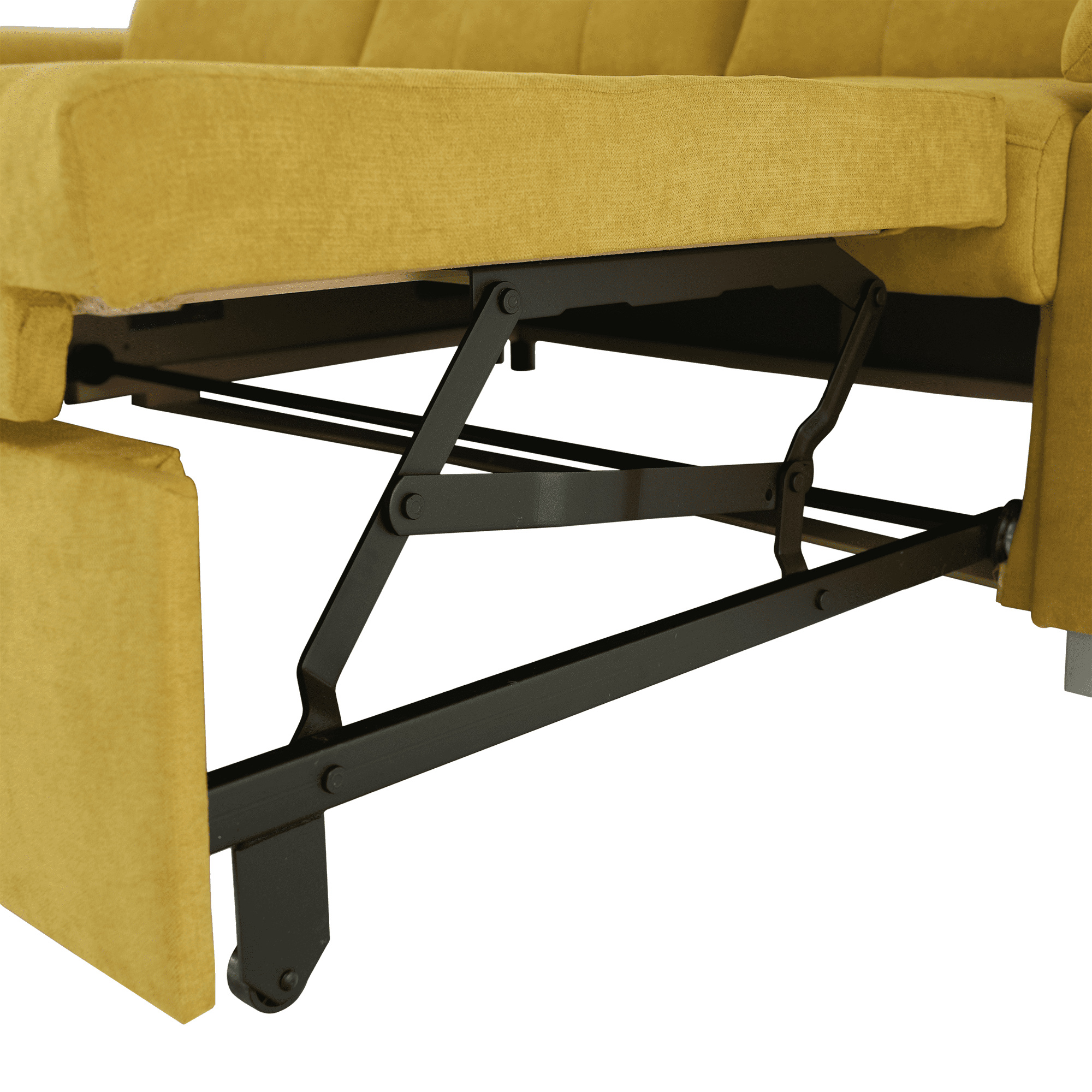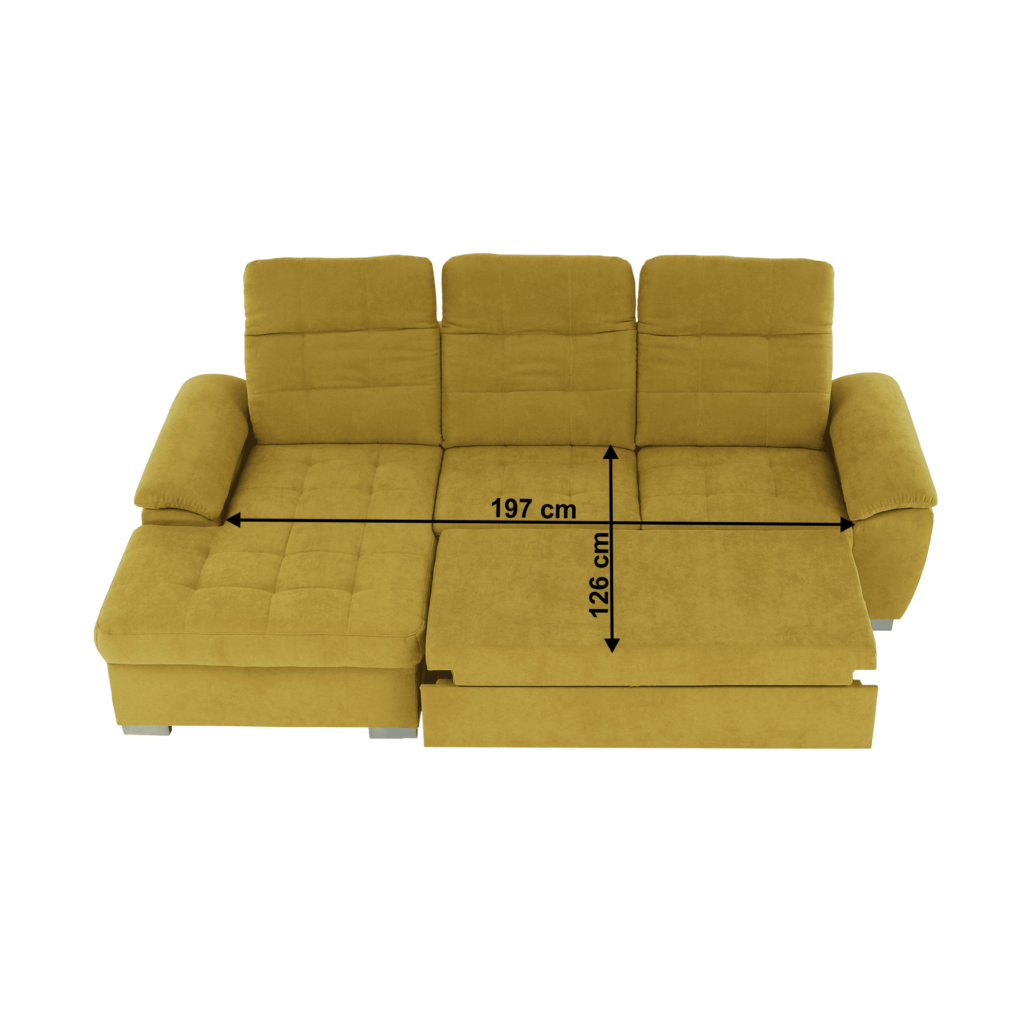 Rohová celočalouněná rozkládací sedací souprava s úložným prostorem EVANGELIN Materiál: látka SORO 40 Oděruodolnost textilie podle testu Martindale: 90 000- 100 000 oděrů Barva: hořčicová Rozměry (ŠxHxV): 258x164x102 / 86 cm Plocha na spaní (ŠxD): 197x126 cm Výška spodního prostoru od podlahy: 5,5 cm Výška sedu: 41 cm Hloubka sedu: 56 cm Délka pohovky s opěrkou: 184 cm Bez opěradla: 172cm Šířka bez boku: 68,5 cm Šířka Otomanů - 96,5 cm (spolu s bokem) Nosnost na osobu: 90 kg Levé provedení. Dodávané bez dekorativních polštářů Polohovací opěrky hlavy. 6 stupňové polohování opěrek Dodávané v demontu.