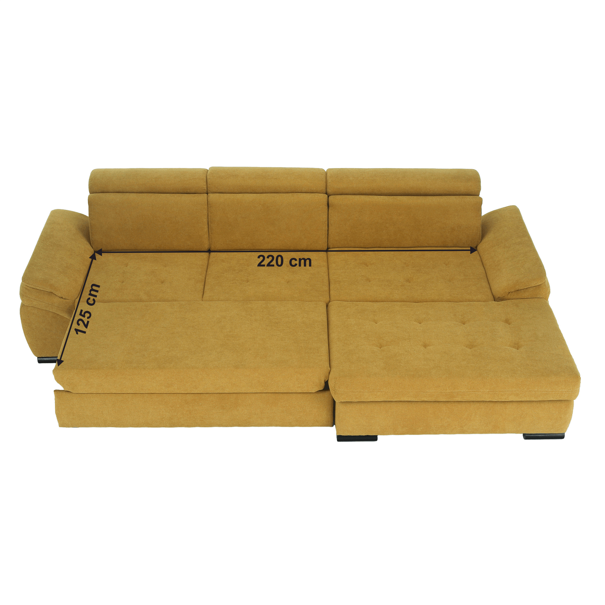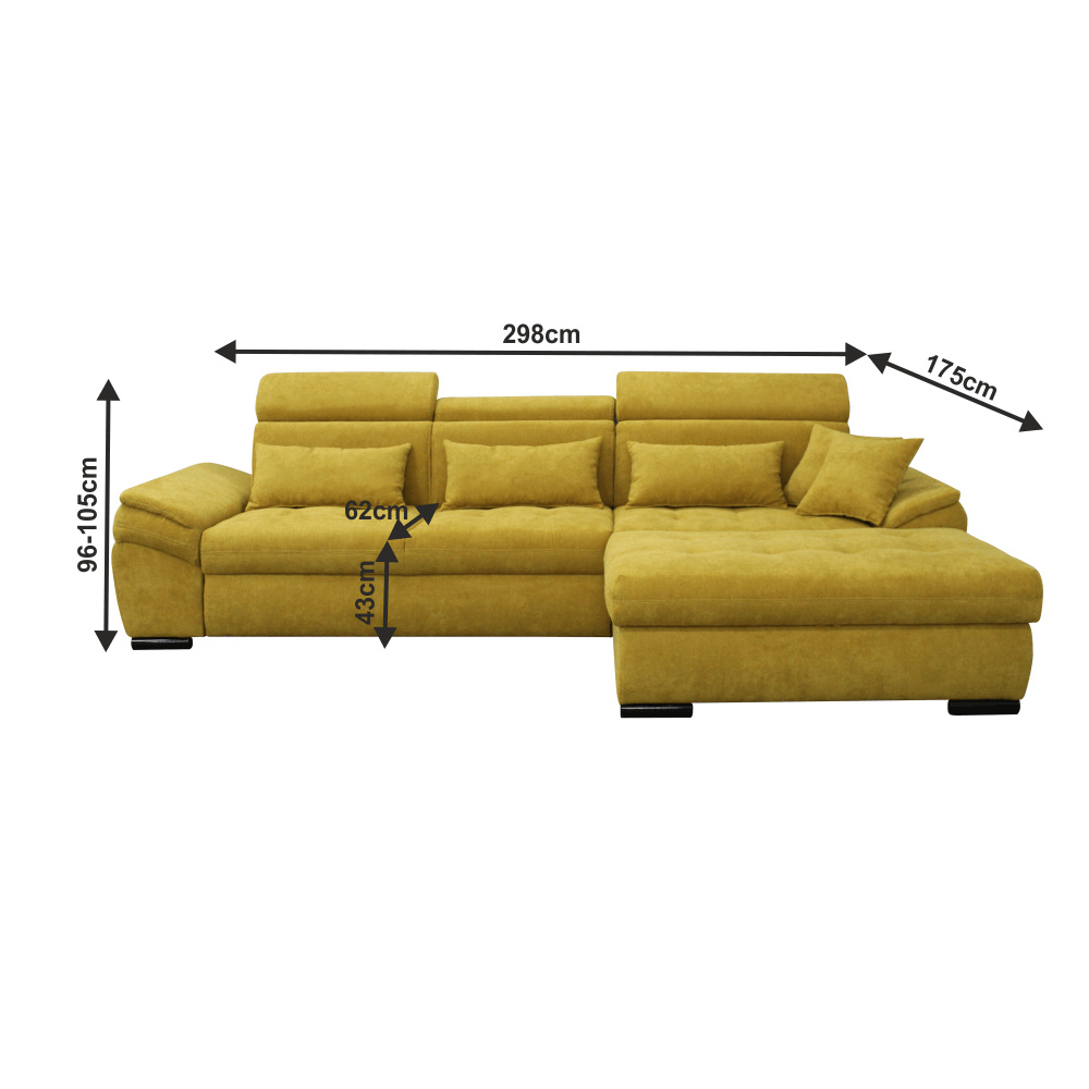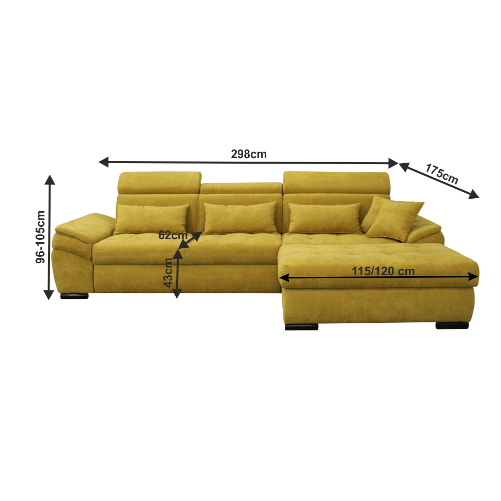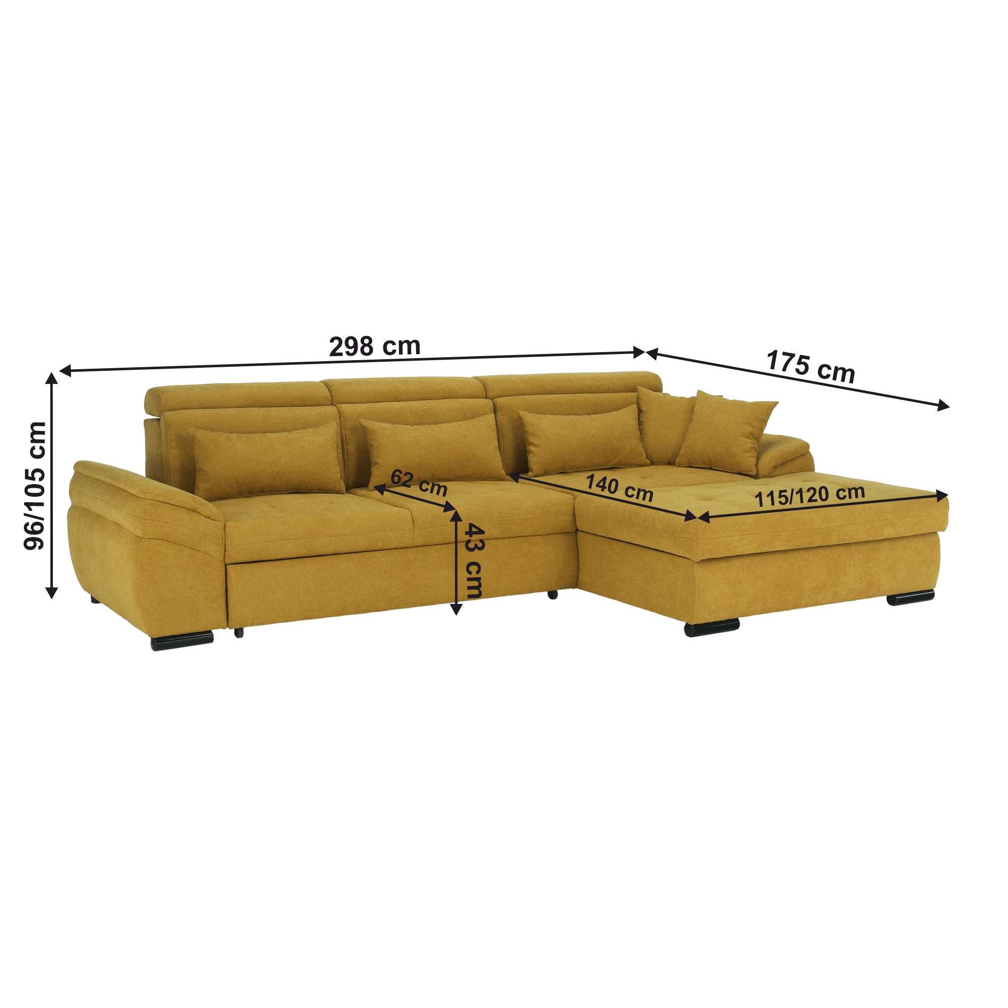 ;"Materiál: látka Alfa 120 Oděruodolnost textilie podle testu Martindale: 55 000 oděrek Barva: 120 hořčicová Rozměry (ŠxHxV): 298x175x96 / 105 cm plocha na spaní (ŠxD): 125x220 cm Výška sedu: 43 cm Hloubka sedu: 62 cm Výška spodního prostoru od podlahy: 5 cm Šířka otomanu: 115/120 cm Hloubka otomanu: 140 cm Nosnost na osobu: 90 kg celočalouněná rohová rozkládací S úložným prostorem Dodávána s polštáři S polohovacími opěrkami hlavy 5 polohovacích opěrek pravé provedení Dodávané v demontu. Možnost objednání v 8 barevných provedeních látky Alfa v ceně 41.590 Kč. Při individuální objednávce je třeba zaplatit 20% zálohu z dané částky. Po uhrazení zálohy bude Vaša objednávka zadána do výroby. Dodací lhůta 6-8 týdnů.