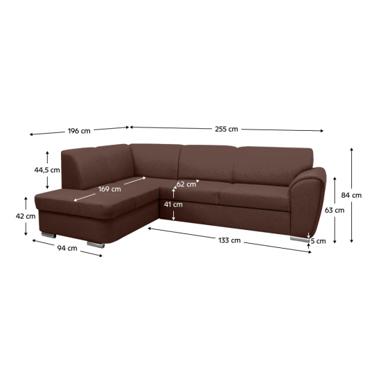 Materiál: látka Malmo 26 Oděruodolnost textilie podle testu Martindale: 30 000 oděrů Barva: hnědá Rozměry (ŠxHxV): 255x196x84 cm Plocha na spaní (ŠxD): 129x195 cm Výška sedu: 41 cm Hloubka sedu: 62 cm Výška zádové opěrky: 44,5 cm Šířka sedáku: 133 cm Rozměry otomanu (ŠxH): 94x169 cm Výška spodního prostoru od podlahy: 5 cm Výška opěrky na ruku: 63 cm Výplň: pružina Falistra/PUR pěna Plastové nožičky Barva nožiček: stříbrná Celočalouněná Rozkládací Rohová Levé provedení Úložný prostor Dodáváno v demontu