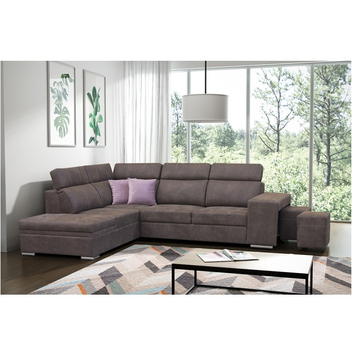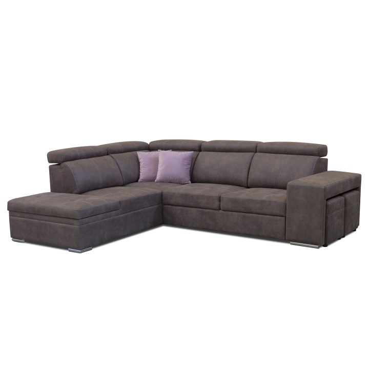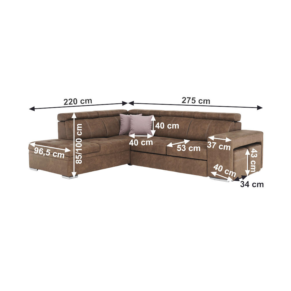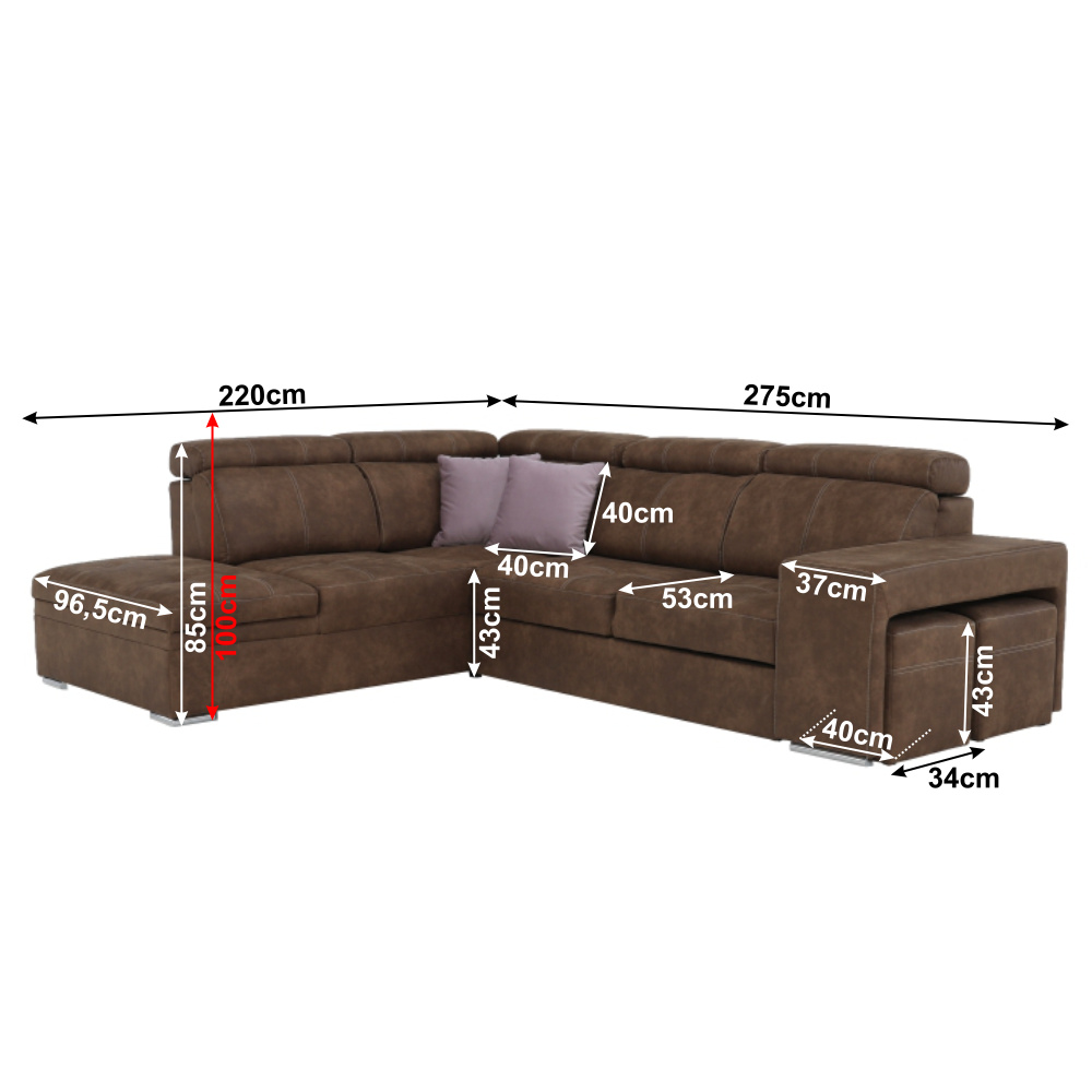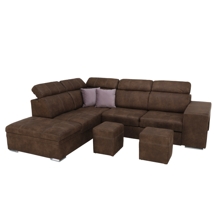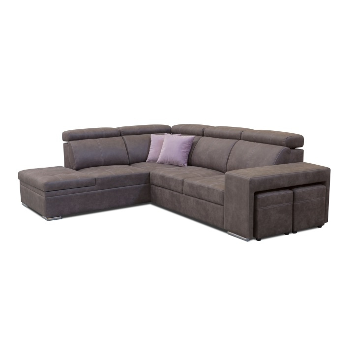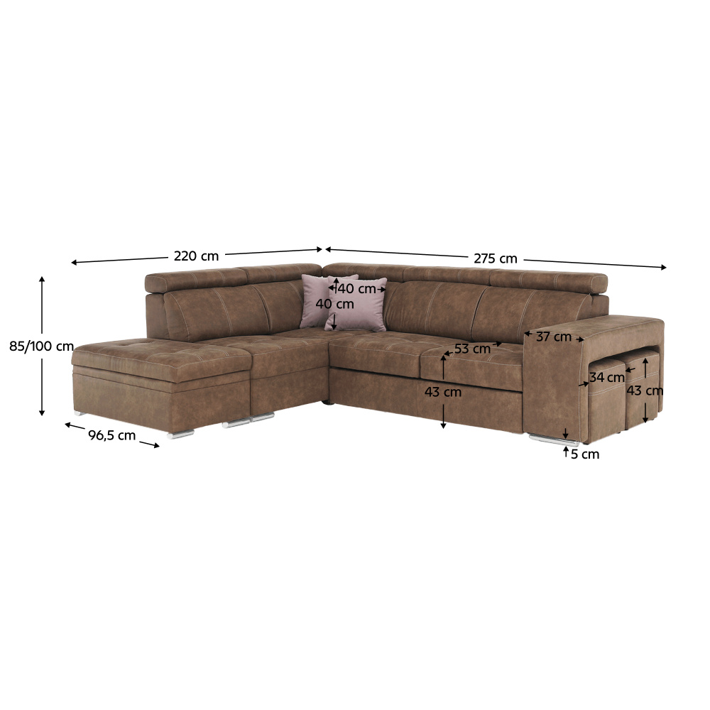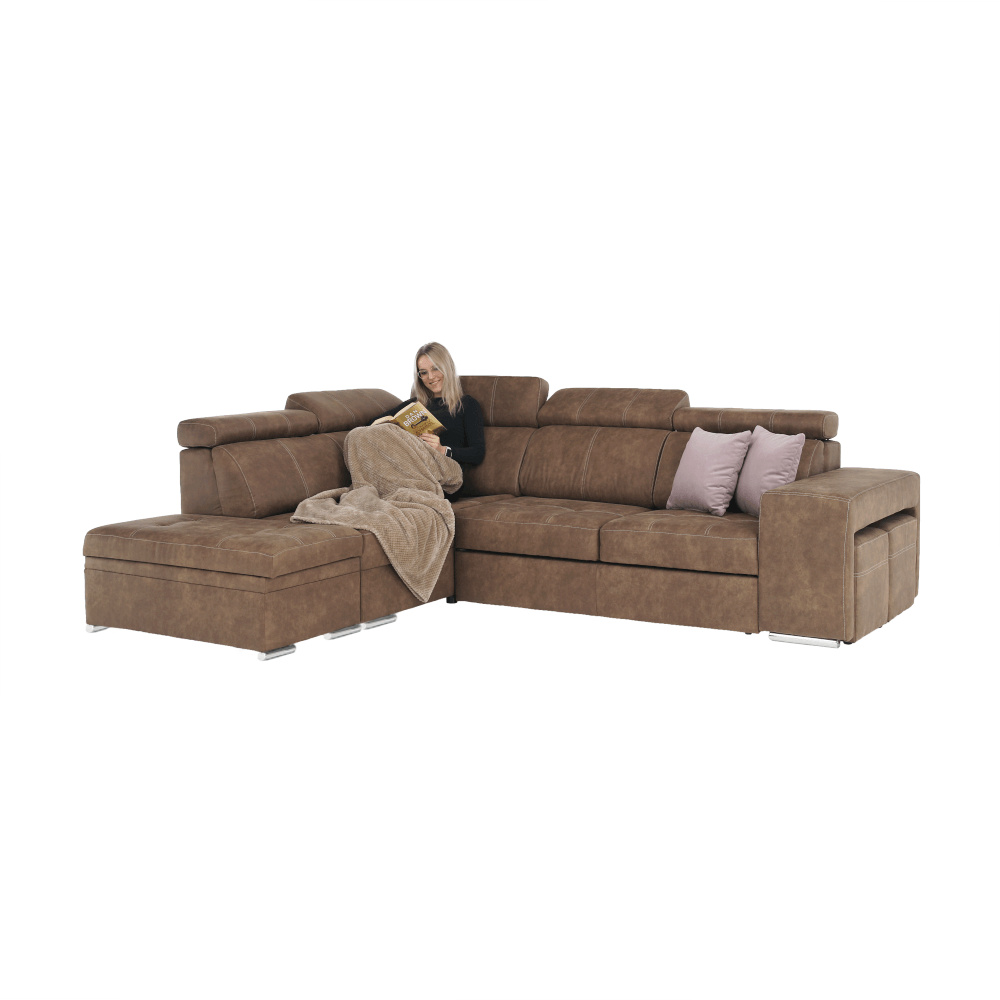 Celočalouněná rohová rozkládací sedací souprava s úložným prostorem a s polohovacím záhlavím. Materiál: Látka Preston / látka Jasmine Oděruodolnost textilie Preston podle testu Martindale: 68 000 oděrek Oděruodolnost textilie Jasmine podle testu Martindale: 90 000 oděrek Barva: hnědá / světle levé provedení. Rozměry (ŠxHxV): 275x220x85 / 100 cm, plocha na spaní (ŠxD): 120x190 cm Výška spodního prostoru od podlahy: 5 cm Výška sedu: 43 cm Hloubka sedu: 53 cm Dodávané s polštáři a s dvěma taburety Nosnost na osobu: 90 kg Dodávané v demontu. Máme pro vás hned čtyři barvy látky Preston a čtyři barvy látky Jasmine, kombinovat tedy můžete dle libosti. Cena sedačky na individuální objednávku je 39.790 Kč. Při individuální objednávce je třeba zaplatit 20% zálohu z dané částky. Po uhrazení zálohy bude Váš požadavek zadána do výroby. Dodací doba 6-8 týdnů.