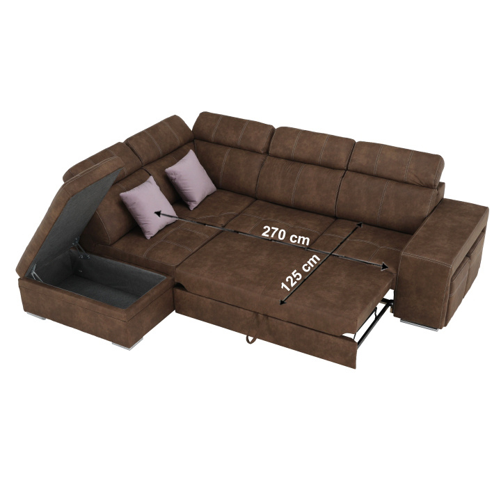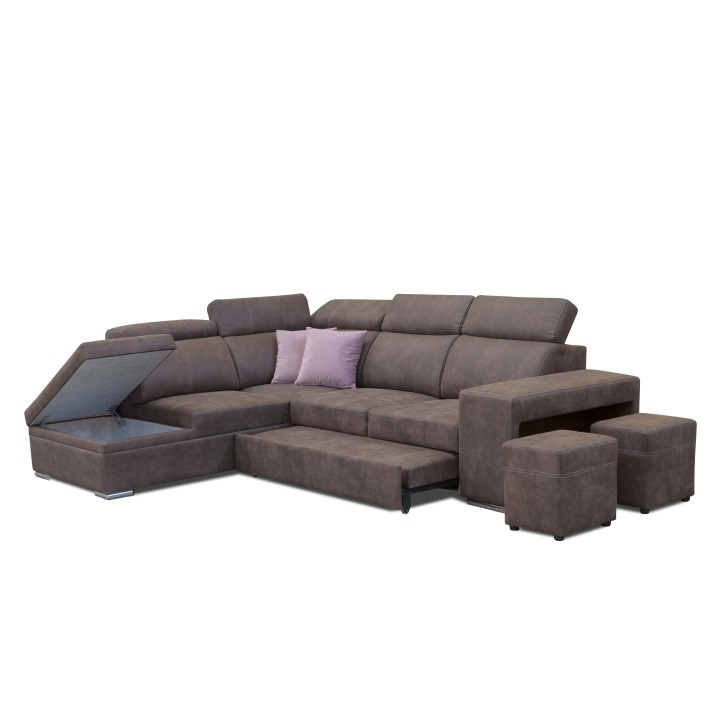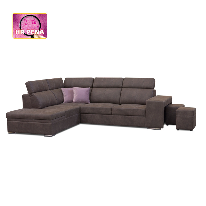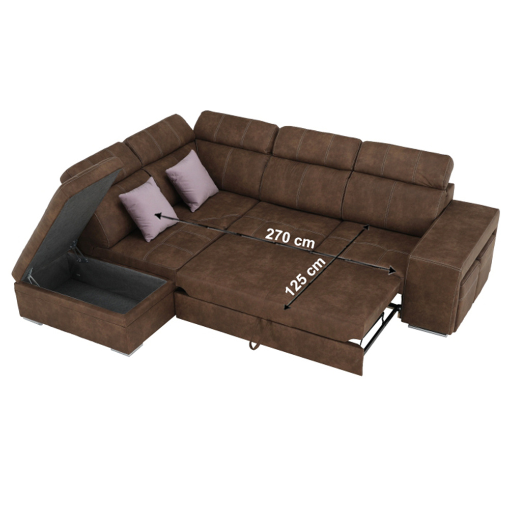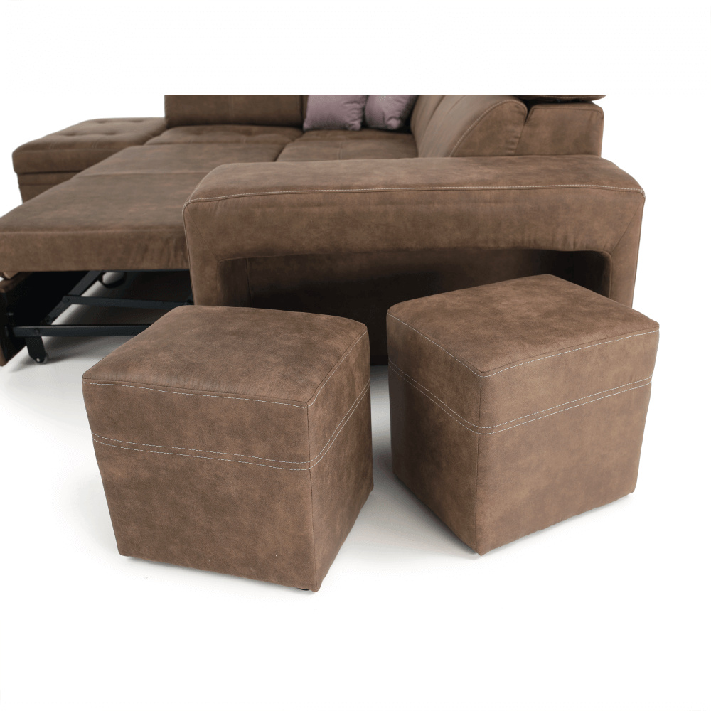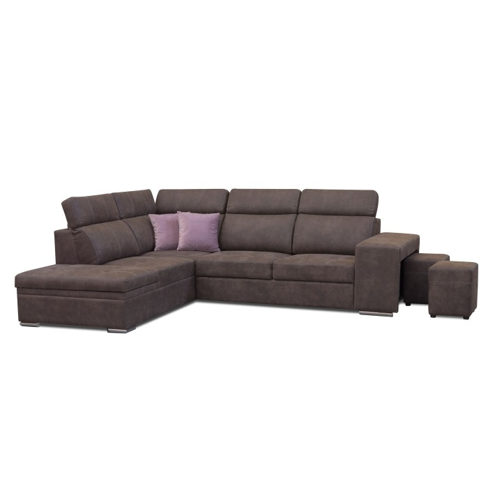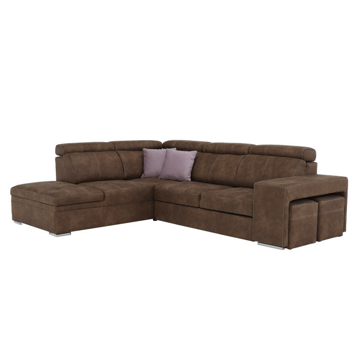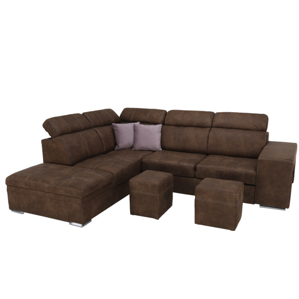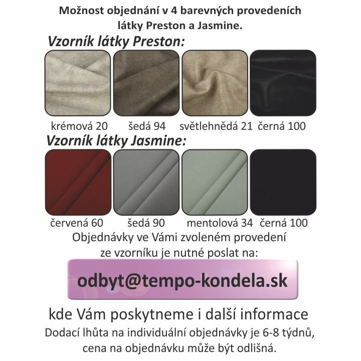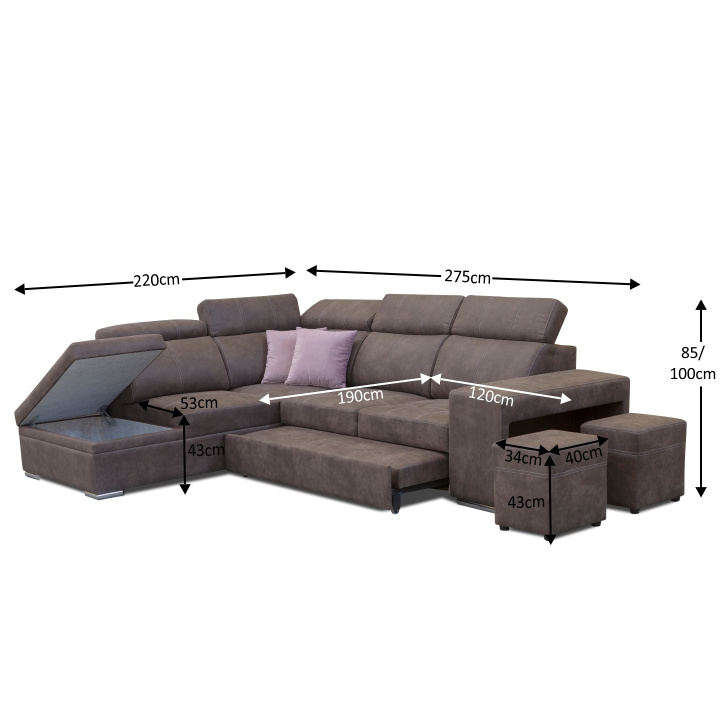 Celočalouněná rohová rozkládací sedací souprava s úložným prostorem a s polohovacím záhlavím. Materiál: Látka Preston / látka Jasmine Oděruodolnost textilie Preston podle testu Martindale: 68 000 oděrek Oděruodolnost textilie Jasmine podle testu Martindale: 90 000 oděrek Barva: hnědá / světle levé provedení. Rozměry (ŠxHxV): 275x220x85 / 100 cm, plocha na spaní (ŠxD): 120x190 cm Výška spodního prostoru od podlahy: 5 cm Výška sedu: 43 cm Hloubka sedu: 53 cm Dodávané s polštáři a s dvěma taburety Nosnost na osobu: 90 kg Dodávané v demontu. Máme pro vás hned čtyři barvy látky Preston a čtyři barvy látky Jasmine, kombinovat tedy můžete dle libosti. Cena sedačky na individuální objednávku je 39.790 Kč. Při individuální objednávce je třeba zaplatit 20% zálohu z dané částky. Po uhrazení zálohy bude Váš požadavek zadána do výroby. Dodací doba 6-8 týdnů.