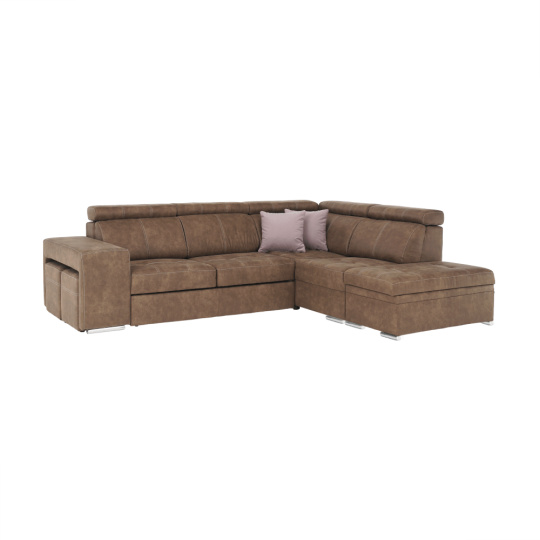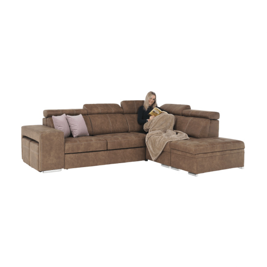 Celočalúnená rohová rozkladacia sedacia súprava s úložným priestorom a s polohovacím záhlavím. Materiál: Látka Preston/ látka Jasmine Oděruodolnost textilie Preston podle testu Martindale: 68 000 oděrek Oděruodolnost textilie Jasmine podle testu Martindale: 90 000 oděrek Farba: hnedá/svetlofialová Pravé prevedenie. Rozmery (ŠxHxV): 275x220x85/100 cm, plocha na spanie (ŠxD): 120x190 cm Výška spodního prostoru od podlahy: 5 cm Výška sedu: 43 cm Hĺbka sedu: 53 cm Dodávané s vankúšmi a s dvoma taburetmi Nosnost na osobu: 90 kg Dodávané v demonte. Máme pro vás hned čtyři barvy látky Preston a čtyři barvy látky Jasmine, kombinovat tedy můžete dle libosti. Cena sedačky na individuální objednávku je 40.990 Kč. Při individuální objednávce je třeba zaplatit 20% zálohu z dané částky. Po uhrazení zálohy bude Váš požadavek zadána do výroby. Dodací doba 6-8 týdnů.
