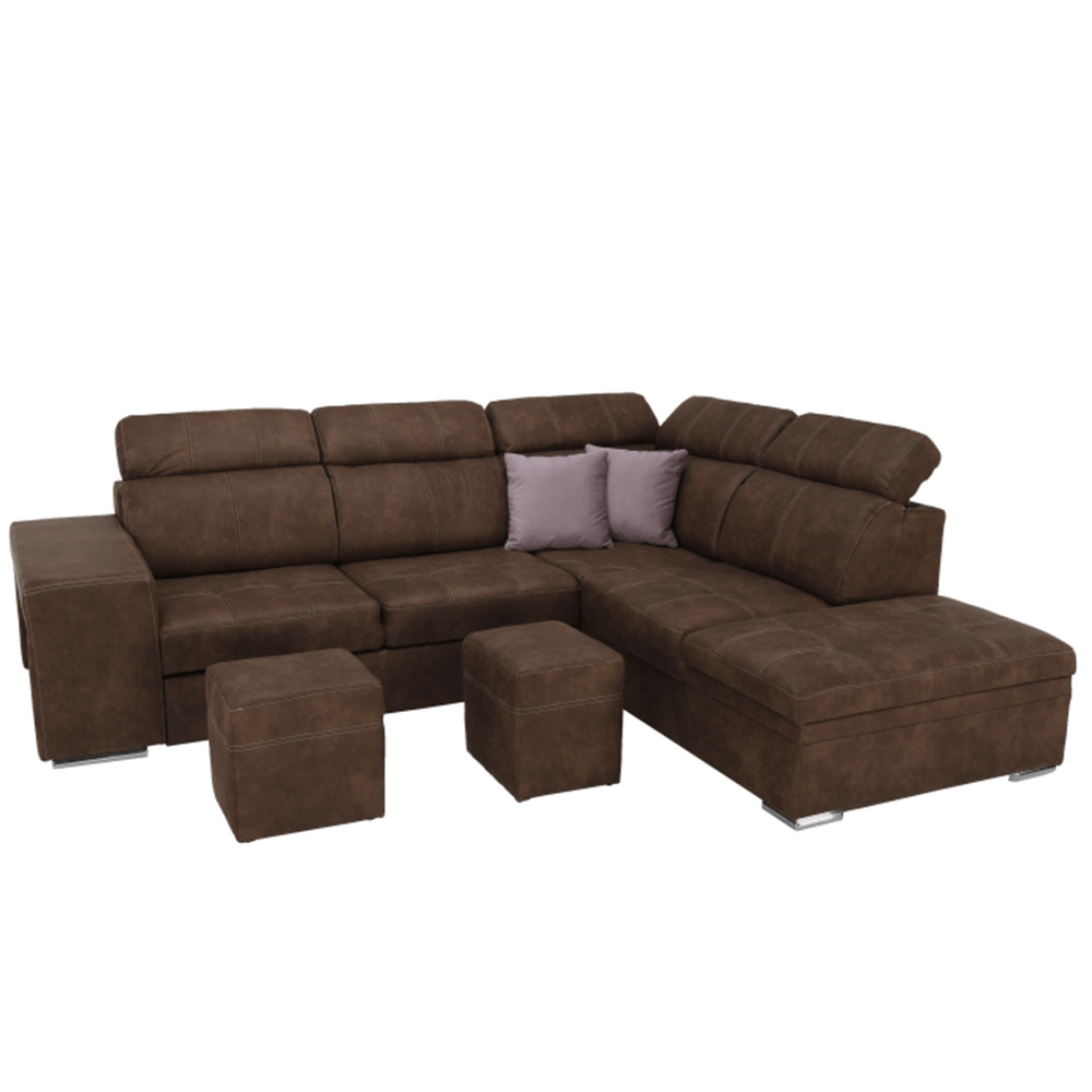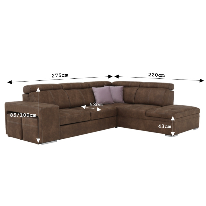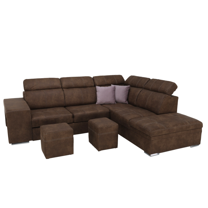Celočalúnená rohová rozkladacia sedacia súprava s úložným priestorom a s polohovacím záhlavím. Materiál: Látka Preston/ látka Jasmine Oděruodolnost textilie Preston podle testu Martindale: 68 000 oděrek Oděruodolnost textilie Jasmine podle testu Martindale: 90 000 oděrek Farba: hnedá/svetlofialová Pravé prevedenie. Rozmery (ŠxHxV): 275x220x85/100 cm, plocha na spanie (ŠxD): 120x190 cm Výška spodního prostoru od podlahy: 5 cm Výška sedu: 43 cm Hĺbka sedu: 53 cm Dodávané s vankúšmi a s dvoma taburetmi Nosnost na osobu: 90 kg Dodávané v demonte. Máme pro vás hned čtyři barvy látky Preston a čtyři barvy látky Jasmine, kombinovat tedy můžete dle libosti. Cena sedačky na individuální objednávku je 40.990 Kč. Při individuální objednávce je třeba zaplatit 20% zálohu z dané částky. Po uhrazení zálohy bude Váš požadavek zadána do výroby. Dodací doba 6-8 týdnů.
