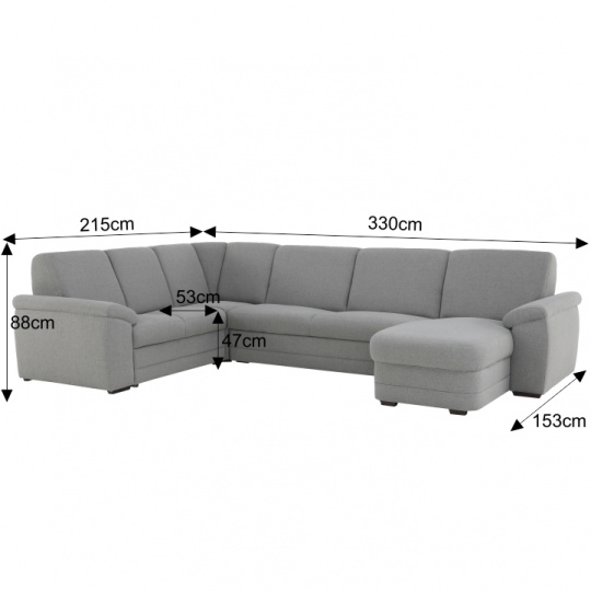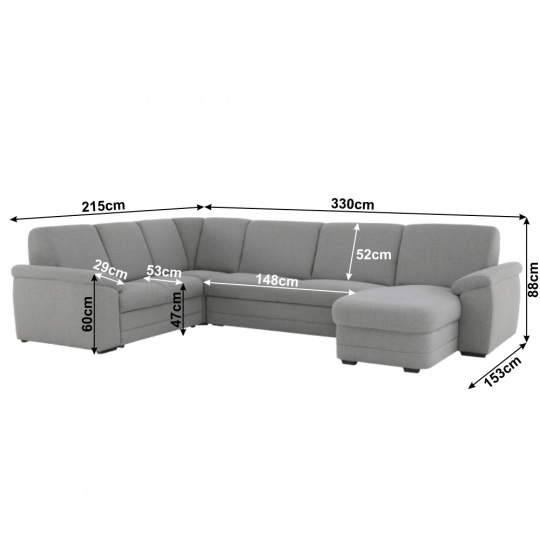 Materiál: látka Cablo Oděruodolnost textilie podle testu Martindale: 72 000 oděrů Barva: šedá 14 Rozměry (ŠxHxV): 330x215/153x88 Plocha na spaní (ŠxD): 120x260 cm Výška sedu: 47 cm Hloubka sedu: 53 cm Šířka volného prostoru mezi otomany: 148 cm Výška nožiček: 3 cm Výška zádové opěrky: 52 cm Opěrka na ruce (ŠxV): 29x60 cm Výška spodního prostoru od podlahy: 3 cm Pružinová výplň Možnost poskládat vlastní rozměr Ve tvaru U Celočalouněná Pravé provedení Rozkládací S úložným prostorem Dodávána v demontu Nabízíme vám možnost zvolit si barevný odstín ze sedmi barev látky Cablo a ze sedmi barev ekokůže. Odstíny naleznete v přiloženém vzorníku. Výběr barevného odstínu poznamenejte při objednávání přímo do poznámky. Při individuální objednávce je třeba zaplatit 20% zálohu z dané částky. Po uhrazení zálohy bude Váš požadavek zadán do výroby. Dodací doba 6-8 týdnů. Cena takto složené sedačky v jiné barvě závisí na počtu jednotlivých dílů, které ji tvoří. Doporučujeme prověřit si konečnou cenu.