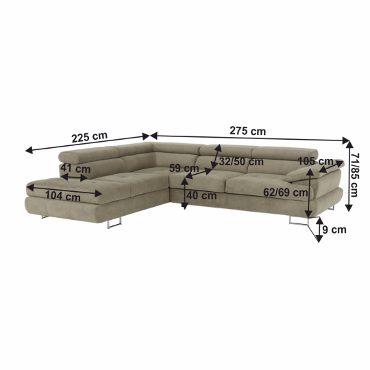 Materiál: látka Soro 13 Oděruodolnost textilie podle testu Martindale: 90 000- 100 000 oděrů Barva: světle hnědý melír Rozměry (ŠxHxV): 275x225x71/85 cm. Výška sedu: 40 cm Hloubka sedu: 59 cm Výška spodního prostoru od podlahy: 9 cm Výška zádové opěrky: 32/50 cm Hloubka sklopené zádové opěrky: 41 cm Opěrka na ruku (HxV... více
